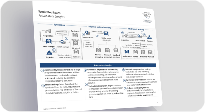 Syndicated Loans Future-state benefits Syndication Diligence and underwriting Closing and servicing Syndicate Diligence results 5 Loan funded 6 7 tes Investor records 3 Principal & interest uq Risk tolerance 4 re Corporation Smart contract Lead arranger Corporation Smart contract Regulator ano 1 Member 1 30% pledged L Assets Loan funding Servicing documents Liabilities Syndication fee payment dispersion Lead arranger Smart contract Project Plan Principal and interest payments Member 2 2 Members selected Member 1 Member 2 Member 3 Lead arranger Member 1 Member 2 Member 3 Regulator based on criteria Member 3 25% pledged 20% pledged 25% pledged Future-state benefits 1 Automated syndicate formation: through 3 Automated diligence and underwriting: 5 Reduced closing time: loan funding is programmable selection criteria within a corporation financial information analysis facilitated in real time, eliminating smart contract, syndicate formation is and risk underwriting are automated, traditional t+3 settlement and centralized automated, reducing the time for a reducing the execution time and the amount lead arranger operations corporation’s loan to be funded of resources required to perform these 6 Servicing disintermediation: activities are 2 Embedded regulator: throughout the 4 activities executed via smart contracts, eliminating the syndicated loan life cycle, regulators are Technology integration: diligence systems need for third-party intermediaries provided with a real-time view of financial communicate pertinent financial information 7 Reducedcounterparty risk: the details to facilitate AML/KYC activities to underwriting systems, streamlining disbursement of principal and interest process execution and reducing underwriting payments throughout the loan life cycle is time automated, reducing operational risk WORLD ECONOMIC FORUM | 2016 71