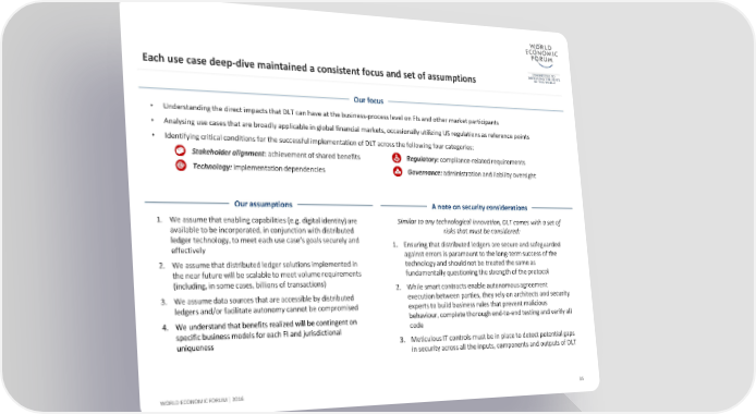 Each use case deep-dive maintained a consistent focus and set of assumptions Our focus • Understanding the direct impacts that DLT can have at the business-process level on FIs and other market participants • Analysing use cases that are broadly applicable in global financial markets, occasionally utilizing US regulations as reference points • Identifying critical conditions for the successful implementation of DLT across the following four categories: Stakeholder alignment: achievement of shared benefits Regulatory: compliance-related requirements Technology: implementation dependencies Governance: administration and liability oversight Our assumptions A note on security considerations 1. We assume that enabling capabilities (e.g. digital identity) are Similar to any technological innovation, DLT comes with a set of available to be incorporated, in conjunction with distributed risks that must be considered: ledger technology, to meet each use case’s goals securely and 1. Ensuring that distributed ledgers are secure and safeguarded effectively against errors is paramount to the long-term success of the 2. We assume that distributed ledger solutions implemented in technology and should not be treated the same as the near future will be scalable to meet volume requirements fundamentally questioning the strength of the protocol (including, in some cases, billions of transactions) 2. While smart contracts enable autonomous agreement 3. We assume data sources that are accessible by distributed execution between parties, they rely on architects and security ledgers and/or facilitate autonomy cannot be compromised experts to build business rules that prevent malicious 4. We understand that benefits realized will be contingent on behaviour, complete thorough end-to-end testing and verify all specific business models for each FI and jurisdictional code uniqueness 3. Meticulous IT controls must be in place to detect potential gaps in security across all the inputs, components and outputs of DLT WORLD ECONOMIC FORUM | 2016 35