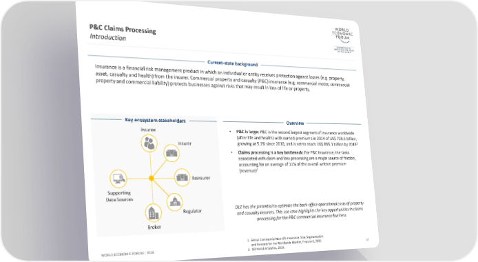 P&C Claims Processing Introduction Current-state background Insurance is a financial risk management product in which an individual or entity receives protection against losses (e.g. property, asset, casualty and health) from the insurer. Commercial property and casualty (P&C) insurance (e.g. commercial motor, commercial property and commercial liability) protects businesses against risks that may result in loss of life or property. Key ecosystem stakeholders Overview Insuree • P&C is large: P&C is the second largest segment of insurance worldwide (after life and health) with earned premiums in 2014 of US$ 728.6 billion, Insurer growing at 5.1% since 2010, and is set to reach US$ 895.1 billion by 20181 • Claims processing is a key bottleneck: For P&C insurance, the tasks associated with claim and loss processing are a major source of friction, accounting for an average of 11% of the overall written premium (revenue)2 Reinsurer Supporting Data Sources Regulator DLT has the potential to optimize the back-office operational costs of property and casualty insurers. This use case highlights the key opportunities in claims Broker processing for the P&C commercial insurance business 1. Global Commercial Non-Life Insurance: Size, Segmentation WORLD ECONOMIC FORUM | 2016 and Forecast for the Worldwide Market, Finaccord, 2015. 57 2. ISO Verisk Analytics, 2016.