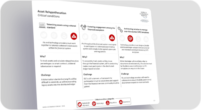 Asset Rehypothecation Critical conditions Tokenizing assets using a shared Fostering engagement among the Architecting solution to manage standard financial ecosystem over-the-counter (OTC) templates FIs and technology providers must work FIs throughout the financial system must agree Technology providers must design a flexible together to tokenize collateral linked assets to participate in a tokenized asset trading distributed ledger solution that accounts for within the financial system system and comply to the agreed upon rules non-standard and future formats of OTC and regulations templates Why? Why? Why? To track assets and calculate rehypothecation To accurately track assets as they move While the ledger will most likely refer to percentages via smart contract, collateral through the financial system, all FIs conducting documents stored externally, the solution must tokenization is required trades must participate in the distributed- be flexible in case modifications to OTC ledger-based solution templates are require in the future Challenge Challenge Challenge A tokenization standard among FIs will be DLT is still unproven; a framework for FIs and technology providers will need to difficult to establish, as will incorporating participation must be established and support collaborate to ensure flexibility and minimal legacy assets into the distributed ledger from the financial services community must be downstream impacts to smart contracts gained Critical condition categories WORLD ECONOMIC FORUM | 2016 Stakeholder Technology Regulatory Governance 117 alignment