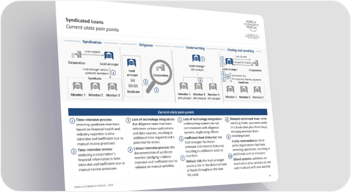 Syndicated Loans Current-state pain points Syndication Diligence Underwriting Closing and servicing Loan request 6 Loan funded 5 Principal & interest Lead arranger 7 Corporation Lead arranger 30% pledged Lead arranger Corporation Lead arranger solicits 1 Lead 8 10 Syndication fee syndicate members arranger Corporation 9 Principal and interest payments Syndicate 2 4 Syndicate Syndicate 3 Member 1 Member 2 Member 3 Member 1 Member 2 Member 3 Member 1 Member 2 Member 3 25% pledged 20% pledged 25% pledged Current-state pain points 1 Time-intensive process: 3 Lack of technology integration: 5 Lack of technology integration: 8 Delayed settlement time: while selecting syndicate members due diligence team members underwriting systems do not verifying funds, payments settle based on financial health and reference various applications communicate with diligence t+3 (trade date plus three days), industry expertise is time- and data sources, resulting in systems, duplicating efforts delaying investors from intensive and inefficient due to additional time required and a 6 Inefficient fund disbursal: the 9 obtaining funds manual review processes potential for errors lead arranger facilitates Costly intermediaries: third- 2 Time-intensive review: 4 Labour-intensive process: the principal and interest disbursal, party organizations facilitate analysing a corporation’s documentation of syndicate resulting in additional costs to servicing operations, resulting in financial information is time- member pledging is labour- 7 investors 10 additional costs to investors intensive and inefficient due to intensive and inefficient due to Default risk: the lead arranger Siloed systems: activities are manual review processes reliance on manual activities poses a risk in the disbursement duplicative since systems do not of funds throughout the loan communicate with one another life cycle WORLD ECONOMIC FORUM | 2016 69