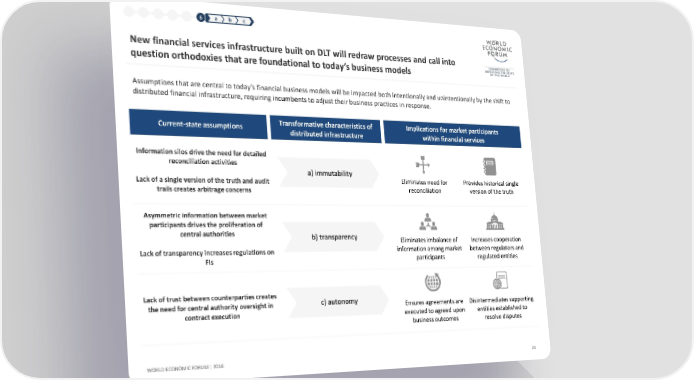 1 2 3 4 5 6 a b c New financial services infrastructure built on DLT will redraw processes and call into question orthodoxies that are foundational to today’s business models Assumptions that are central to today’s financial business models will be impacted both intentionally and unintentionally by the shift to distributed financial infrastructure, requiring incumbents to adjust their business practices in response. Current-state assumptions Transformative characteristics of Implications for market participants distributed infrastructure within financial services Informationsilos drive the need for detailed reconciliation activities a) immutability Eliminates need for Provides historical single Lack of a single version of the truth and audit reconciliation version of the truth trails creates arbitrage concerns Asymmetric information between market participants drives the proliferation of central authorities b) transparency Eliminates imbalance of Increases cooperation Lack of transparency increases regulations on information among market between regulators and FIs participants regulated entities Lack of trust between counterparties creates c) autonomy the need for central authority oversight in Ensures agreements are Disintermediates supporting contract execution executed to agreed upon entities established to business outcomes resolve disputes WORLD ECONOMIC FORUM | 2016 24