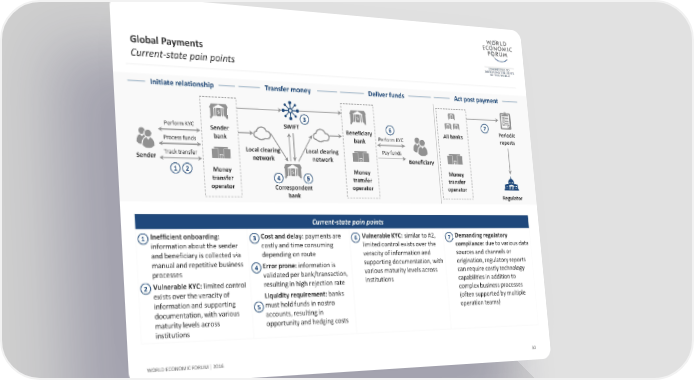 Global Payments Current-state pain points Initiate relationship Transfer money Deliver funds Actpost payment 3 7 Perform KYC Sender SWIFT Beneficiary 6 All banks Periodic bank bank Perform KYC reports Process funds Track transfer Local clearing Local clearing Pay funds Sender network network Beneficiary 1 2 Money Money Money transfer 4 5 transfer transfer operator Correspondent operator operator bank Regulator Current-state pain points 1 Inefficient onboarding: 3 Cost and delay: payments are 6 Vulnerable KYC: similar to #2, 7 Demanding regulatory information aboutthe sender costly and time consuming limited control exists over the compliance: due to various data and beneficiary is collected via depending on route veracity of information and sources and channels or manual and repetitive business 4 Error prone: information is supporting documentation, with origination, regulatory reports processes validated per bank/transaction, various maturity levels across can require costly technology 2 Vulnerable KYC: limited control resulting in high rejection rate institutions capabilities in addition to exists over the veracity of Liquidity requirement: banks complex business processes information and supporting 5 must hold funds in nostro (often supported by multiple documentation, with various accounts, resulting in operation teams) maturity levels across opportunity and hedging costs institutions WORLD ECONOMIC FORUM | 2016 50