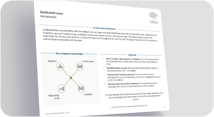 Syndicated Loans Introduction Current-state background Syndicated loans provide clients with the ability to secure large-scale diversified financing at the current market rate. These loans are funded by a group of investors (e.g. syndicate), where one investor serves as the lead arranger. The lead arranger serves as the underwriter for the loan and performs all administrative tasks throughout the loan life cycle, charging a fee based on the complexity and risk factors associated with the loan. Key ecosystem stakeholders Overview • The US market is dominated by incumbents: Four US FIs accounted for Regulator Lead Arranger more than 50% of the market share (US$ 1,917 billion total volume) in 1 2014 • The EMEA market is large: The total EMEA syndicated loan volume in 1 2014 amounted to US$ 1,214.5 billion • The Asia-Pacific market is growing: The Asia-Pacific (ex-Japan) syndicated loan volume increased by 22% in 2014, bringing total volume to US$ 524.2 billion1 • The Latin American market is immature: The total Latin American 1 syndicated loan volume in 2014 amounted to US$ 42.2 billion Requesting Syndicate DLT has the potential to optimize syndicated loan back-office operations. This Entity use case highlights key opportunities in the end-to-end syndicated loan process 1. Global Syndicated Loans: League Tables 2014, Bloomberg, 2014. WORLD ECONOMIC FORUM | 2016 66