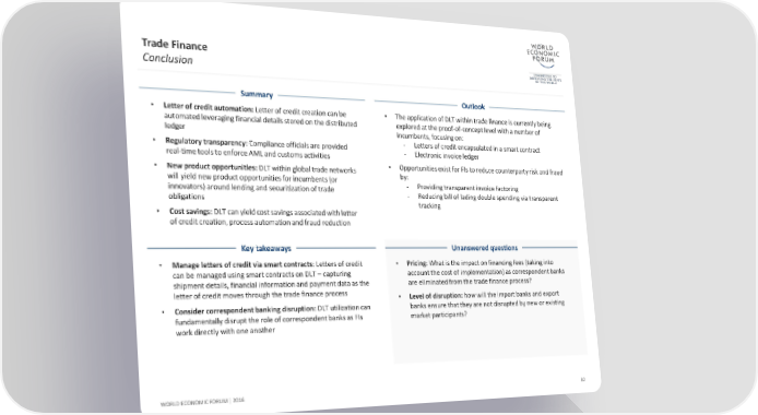 Trade Finance Conclusion Summary Outlook • Letter of credit automation: Letter of credit creation can be • The application of DLT within trade finance is currently being automated leveraging financial details stored on the distributed explored at the proof-of-concept level with a number of ledger incumbents, focusing on: • Regulatory transparency:Compliance officials are provided - Letters of credit encapsulated in a smart contract real-time tools to enforce AML and customs activities - Electronic invoice ledger • New product opportunities: DLT within global trade networks • Opportunities exist for FIs to reduce counterparty risk and fraud will yield new product opportunities for incumbents (or by: innovators) around lending and securitization of trade - Providing transparent invoice factoring obligations - Reducing bill of lading double spending via transparent tracking • Cost savings: DLT can yield cost savings associated with letter of credit creation, process automation and fraud reduction Key takeaways Unanswered questions • Manage letters of credit via smart contracts: Letters of credit • Pricing: What is the impact on financing fees (taking into can be managedusingsmartcontracts on DLT – capturing account the cost of implementation) as correspondent banks shipment details, financial information and payment data as the are eliminated from the trade finance process? letter of credit moves through the trade finance process • Level of disruption: how will the import banks and export • Consider correspondent banking disruption:DLT utilization can banks ensure that they are not disrupted by new or existing fundamentally disrupt the role of correspondent banks as FIs market participants? work directly with one another WORLD ECONOMIC FORUM | 2016 82