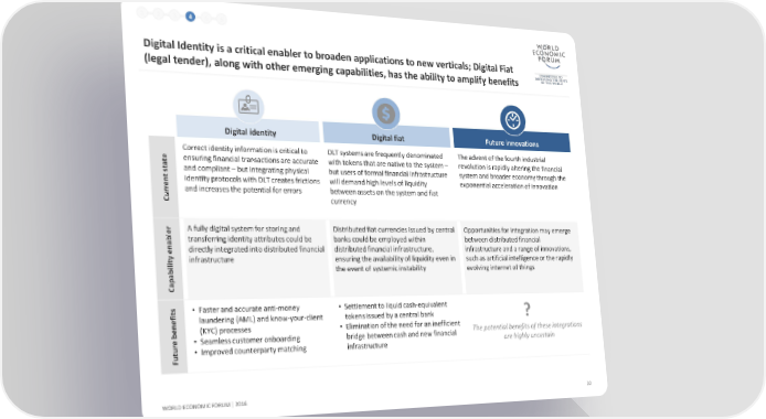 1 2 3 4 5 6 Digital Identity is a critical enabler to broaden applications to new verticals; Digital Fiat (legal tender), along with other emerging capabilities, has the ability to amplify benefits Digital identity Digital fiat Future innovations Correct identity information is critical to DLT systemsare frequently denominated The adventof the fourth industrial teta ensuring financial transactions are accurate with tokens that are native to the system – revolution is rapidly altering the financial st and compliant – but integrating physical but users of formal financial infrastructure system and broader economy through the nre identity protocols with DLT creates frictions will demand high levels of liquidity exponential acceleration of innovation rCu and increases the potential for errors between assets on the system and fiat currency rble Afully digital system for storing and Distributed fiat currencies issued by central Opportunities for integration may emerge an transferring identity attributes could be banks could be employed within between distributed financial e directly integrated into distributed financial distributed financial infrastructure, infrastructure and a range of innovations, tyiliinfrastructure ensuring the availability of liquidity even in such as artificial intelligence or the rapidly bpa the event of systemic instability evolving internet of things aC tsfi • Faster and accurate anti-money • Settlement to liquid cash-equivalent een laundering (AML) and know-your-client tokens issued by a central bank ? b (KYC) processes • Elimination of the need for an inefficient The potential benefits of these integrations er • Seamless customer onboarding bridge between cash and new financial are highly uncertain tuFu • Improvedcounterparty matching infrastructure WORLD ECONOMIC FORUM | 2016 22