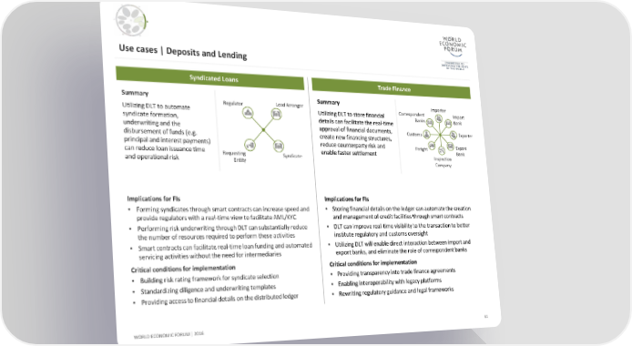 Use cases | Deposits and Lending Syndicated Loans Trade Finance Summary Regulator Lead Arranger Summary Importer Utilizing DLT to automate Utilizing DLT to store financial Correspondent Import syndicate formation, details can facilitate the real-time Banks Bank underwriting and the approval of financial documents, Customs Exporter disbursement of funds (e.g. create new financing structures, principal and interest payments) reduce counterparty risk and Freight Export can reduce loan issuance time Requesting enable faster settlement Bank and operational risk Entity Syndicate Inspection Company Implications for FIs Implications for FIs • Forming syndicates through smart contracts can increase speed and • Storing financial details on the ledger can automate the creation provide regulators with a real-time view to facilitate AML/KYC and management of credit facilities through smart contracts • Performing risk underwriting through DLT can substantially reduce • DLT can improve real-time visibility to the transaction to better the number of resources required to perform these activities institute regulatory and customs oversight • Smart contracts can facilitate real-time loan funding and automated • Utilizing DLT will enable direct interaction between import and servicing activities without the need for intermediaries export banks, and eliminate the role of correspondent banks Critical conditions for implementation Critical conditions for implementation • Building risk rating framework for syndicate selection • Providing transparency into trade finance agreements • Standardizing diligence and underwriting templates • Enabling interoperability with legacy platforms • Providing access to financial details on the distributed ledger • Rewriting regulatory guidance and legal frameworks WORLD ECONOMIC FORUM | 2016 41