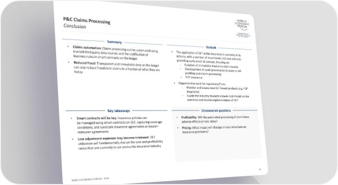 P&C Claims Processing Conclusion Summary Outlook • Claims automation:Claims processing can be automated using • The application of DLT within insurance is currently in its trusted third-party data sources and the codification of infancy, with a number of incumbents and new entrants business rules in smart contracts on the ledger providing early proof of concept, focusing on: • Reduced fraud:Transparentand immutable data on the ledger - Creation of immutable insurance claim records can also reduce fraudulent claims to a fraction of what they are - Development of asset provenance to assist in risk today profiling and claims processing - P2P insurance • Opportunities exist for regulators/FIs to: - Monitor and assess new DLT-based products (e.g. P2P insurance) - Guide the industry towards a lower-cost model via the common and shared implementation ofDLT Key takeaways Unanswered questions • Smart contracts will be key: Insurance policies can • Profitability: Will the automated processing of claims have bemanagedusingsmartcontracts on DLT, capturing coverage adverse effects on loss ratios? conditions, and syndicate insurance agreements or insurer- • Pricing: What impact will changes in loss ratios have on reinsurer agreements insurance premiums? • Loss adjustment expensesmay become irrelevant:DLT utilization will fundamentally disrupt the cost and profitability ratios that are currently in use across the insurance industry WORLD ECONOMIC FORUM | 2016 64