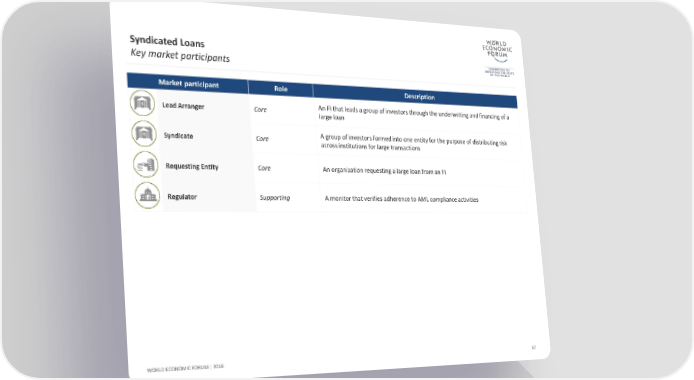 Syndicated Loans Key market participants Market participant Role Description Lead Arranger Core An FI that leads a group of investors through the underwriting and financing of a large loan Syndicate Core A group of investors formed into one entity for the purpose of distributing risk across institutions for large transactions RequestingEntity Core An organization requesting a large loan from an FI Regulator Supporting A monitor that verifies adherence to AML compliance activities WORLD ECONOMIC FORUM | 2016 67