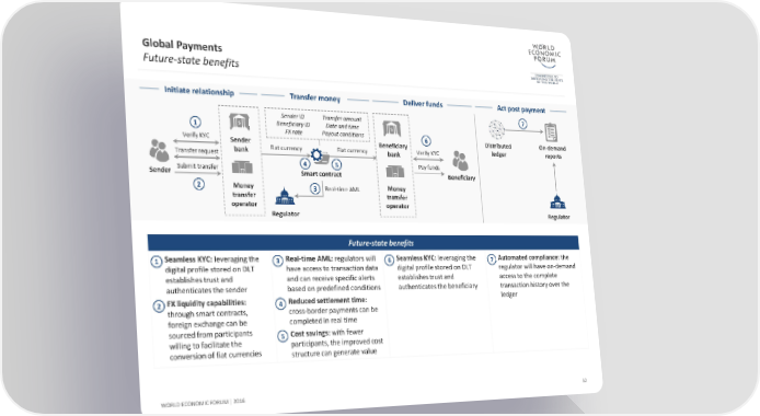 Global Payments Future-state benefits Initiate relationship Transfer money Deliver funds Actpost payment Sender ID Transfer amount 7 1 Beneficiary ID Date and time FX rate Payout conditions 6 Distributed On-demand Verify KYC Sender Beneficiary bank Fiat currency Fiat currency bank Verify KYC ledger reports Transfer request Submit transfer 4 5 Pay funds Sender Smart contract Beneficiary 2 Money 3 Real-time AML Money transfer transfer operator operator Regulator Regulator Future-state benefits 1 Seamless KYC: leveraging the 3 Real-time AML: regulators will 6 Seamless KYC: leveraging the 7 Automated compliance: the digital profile stored on DLT have access to transaction data digital profile stored on DLT regulator will have on-demand establishes trust and and can receive specific alerts establishes trust and access to the complete authenticates the sender based on predefined conditions authenticates the beneficiary transaction history over the 2 FXliquidity capabilities: 4 Reduced settlement time: ledger through smart contracts, cross-border payments can be foreign exchange can be completed in real time sourced from participants 5 Cost savings: with fewer willing to facilitate the participants, the improved cost conversion of fiat currencies structure can generate value WORLD ECONOMIC FORUM | 2016 52