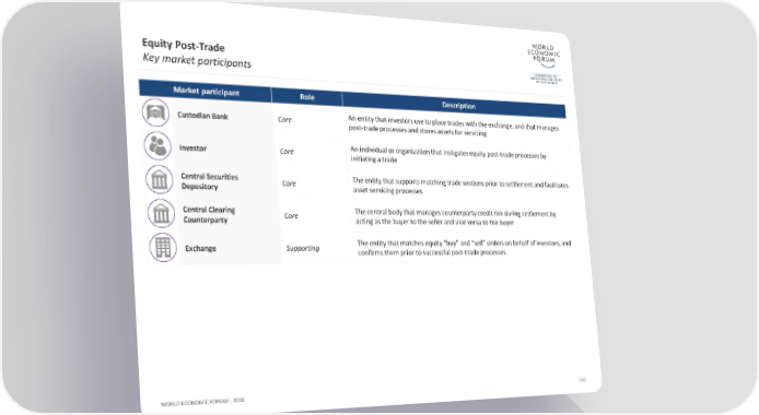 Equity Post-Trade Key market participants Market participant Role Description Custodian Bank Core An entity that investors use to place trades with the exchange, and that manages post-trade processes and stores assets for servicing Investor Core An individual or organization that instigates equity post-trade processes by initiating a trade Central Securities Core The entity that supports matching trade sections prior to settlement and facilitates Depository asset servicing processes Central Clearing Core The central body that manages counterparty credit risk during settlement by Counterparty acting as the buyer to the seller and vice versa to the buyer Exchange Supporting Theentity that matches equity “buy” and “sell” orders on behalf of investors, and confirms them prior to successful post-trade processes WORLD ECONOMIC FORUM | 2016 121