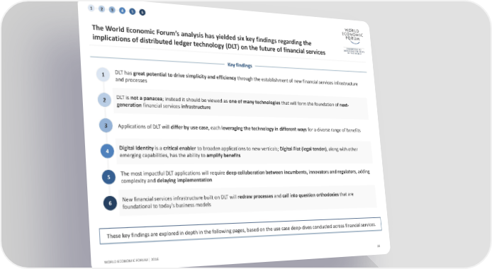 1 2 3 4 5 6 The World Economic Forum’s analysis has yielded six key findings regarding the implications of distributed ledger technology (DLT) on the future of financial services Key findings 1 DLT has great potential to drive simplicity and efficiency through the establishment of new financial services infrastructure and processes 2 DLT is not a panacea; instead it should be viewed as one of many technologies that will form the foundation of next- generation financial services infrastructure 3 Applications of DLT will differ by use case, each leveraging the technology in different ways for a diverse range of benefits 4 Digital Identity is a critical enabler to broaden applications to new verticals; Digital Fiat (legal tender), along with other emerging capabilities, has the ability to amplify benefits 5 The most impactful DLT applications will require deep collaboration between incumbents, innovators and regulators, adding complexity and delaying implementation 6 Newfinancial services infrastructure built on DLT will redraw processes and call into question orthodoxies that are foundational to today’s business models These key findings are explored in depth in the following pages, based on the use case deep-dives conducted across financial services. WORLD ECONOMIC FORUM | 2016 18