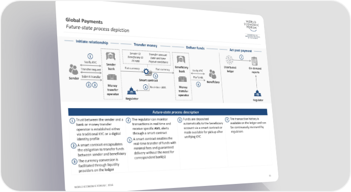 Global Payments Future-state process depiction Initiate relationship Transfer money Deliver funds Actpost payment Sender ID Transfer amount 7 1 Beneficiary ID Date and time FX rate Payout conditions Distributed On-demand Verify KYC Sender Beneficiary bank Fiat currency Fiat currency bank Verify KYC ledger reports Transfer request Submit transfer 5 Pay funds Sender Smart contract 6 Beneficiary 2 3 Money 4 Real-time AML Money transfer transfer operator operator Regulator Regulator Future-state process description 1 Trust between the senderand a 4 The regulator can monitor 6 Funds are deposited 7 The transaction history is bank or money transfer transactions in real time and automatically to the beneficiary available on the ledger and can operator is established either receive specific AML alerts account via a smart contract or be continuously reviewed by via traditional KYC or a digital through a smart contract made available for pickup after regulators identity profile 5 A smart contract enables the verifying KYC 2 A smart contract encapsulates real-time transfer of funds with the obligation to transfer funds minimal fees and guaranteed between sender and beneficiary delivery without the need for 3 The currency conversion is correspondent bank(s) facilitated through liquidity providers on the ledger WORLD ECONOMIC FORUM | 2016 51