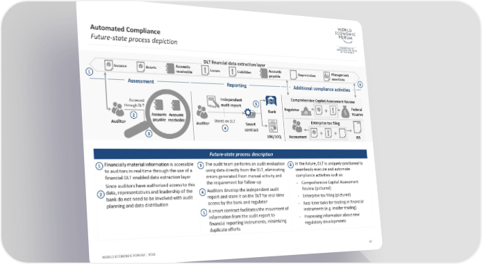 Automated Compliance Future-state process depiction DLT financial data extraction layer Income Assets Accounts Losses Liabilities Accounts Depreciation Management receivable payable assertions 1 6 Assessment Reporting Additional compliance activities Independent Comprehensive Capital Assessment Review Accessed audit report 5 Federal through DLT Bank Regulator + Reserve 2 Accounts Accounts Auditor payable receivable Auditor Stored on DLT Smart Enterprise tax filing 4 contract + + 3 10K/10Q Accountant IRS Future-state process description 1 Financially material information is accessible 3 Theauditteam performs an audit evaluation 6 Inthe future, DLT is uniquely positioned to to auditors in real time through the use of a using data directly from the DLT, eliminating seamlessly execute and automate financial DLT enabled data extraction layer errors generated from manual activity and compliance activities such as: Since auditors have authorized access to this the requirement for follow-up - Comprehensive Capital Assessment 2 data, representatives and leadership of the 4 Auditors develop the independent audit Review (pictured) bank do not need to be involved with audit report and store it on the DLT for real-time - Enterprise tax filing (pictured) planning and data distribution access by the bank and regulator - Real time tasks for trading in financial 5 A smart contract facilitates the movement of instruments (e.g. insider trading) information from the audit report to - Processing information about new financial reporting instruments, minimizing regulatory developments duplicate efforts WORLD ECONOMIC FORUM | 2016 97