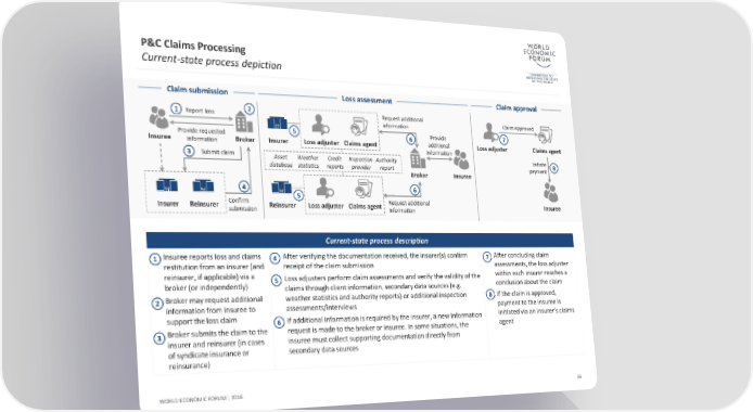 P&C Claims Processing Current-state process depiction Claim submission Loss assessment Claim approval 1 Report loss 2 Request additional Claim approved information Provide requested 5 6 Provide 7 Insuree information Broker Insurer Loss adjuster Claims agent additional Loss adjuster Claims agent information 3 Submit claim Asset Weather Credit Inspection Authority Initiate 8 database statistics reports provider report payment Broker Insuree 4 6 Confirm 5 Request additional Insurer Reinsurer submission Reinsurer Loss adjuster Claims agent information Insuree Current-state process description 1 Insuree reports loss and claims 4 After verifying the documentation received, the insurer(s) confirm 7 After concluding claim restitution from an insurer (and receipt of the claim submission assessments, the loss adjuster reinsurer, if applicable) via a 5 Loss adjusters perform claim assessments and verify the validity of the within each insurer reaches a broker (or independently) claims through client information, secondary data sources (e.g. conclusion about the claim 2 Broker may request additional weatherstatistics and authority reports) or additional inspection 8 If the claim is approved, information from insuree to assessments/interviews payment to the insuree is support the loss claim 6 If additional information is required by the insurer, a new information initiated via an insurer’s claims 3 Broker submits the claim to the request is made to the broker or insuree. In some situations, the agent insurer and reinsurer (in cases insuree must collect supporting documentation directly from of syndicate insurance or secondary data sources reinsurance) WORLD ECONOMIC FORUM | 2016 59
