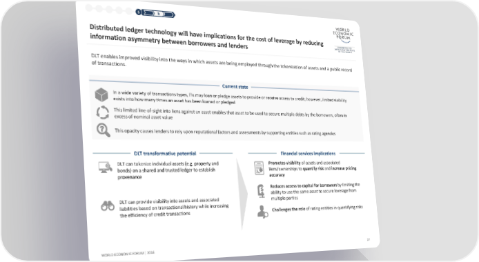 1 2 3 4 5 6 b Distributed ledger technology will have implications for the cost of leverage by reducing information asymmetry between borrowers and lenders DLT enables improved visibility into the ways in which assets are being employed through the tokenization of assets and a public record of transactions. Current state In a wide variety of transactions types, FIs may loan or pledge assets to provide or receive access to credit; however, limited visibility exists into how many times an asset has been loaned or pledged This limited line-of-sight into liens against an asset enables that asset to be used to secure multiple debts by the borrowers, often in excess of nominal asset value This opacity causes lenders to rely upon reputational factors and assessments by supporting entities such as rating agencies DLT transformative potential Financial services implications DLT can tokenize individual assets (e.g. property and Promotes visibility of assets and associated bonds) on a shared and trusted ledger to establish liens/ownerships to quantify risk and increase pricing provenance accuracy Reduces access to capital for borrowers by limiting the ability to use the same asset to secure leverage from DLT can provide visibility into assets and associated multiple parties liabilities based on transactional history while increasing the efficiency of credit transactions Challenges the role of rating entities in quantifying risks WORLD ECONOMIC FORUM | 2016 27