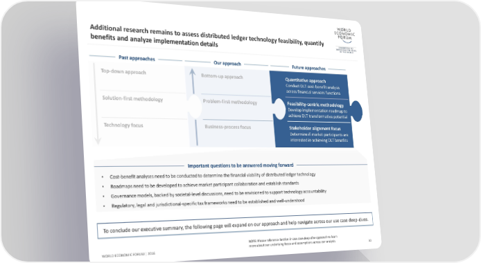 Additional research remains to assess distributed ledger technology feasibility, quantify benefits and analyze implementation details Past approaches Our approach Future approaches Top-down approach Bottom-up approach Quantitative approach Conduct DLT cost-benefit analysis across financial services functions Solution-first methodology Problem-first methodology Feasibility-centric methodology Developimplementation roadmap to achieve DLT transformative potential Technology focus Business-process focus Stakeholder alignment focus Determine if market participants are interested in achieving DLT benefits Important questions to be answered moving forward • Cost-benefit analyses need to be conducted to determine the financial viability of distributed ledger technology • Roadmaps need to be developed to achieve market participant collaboration and establish standards • Governance models, backed by societal-level discussions, need to be envisioned to support technology accountability • Regulatory, legal and jurisdictional-specific tax frameworks need to be established and well-understood To conclude our executive summary, the following page will expand on our approach and help navigate across our use case deep-dives. NOTE: Please reference Section 3: Use case deep-dive approach to learn WORLD ECONOMIC FORUM | 2016 more about our underlying focus and assumptions across our analysis. 30