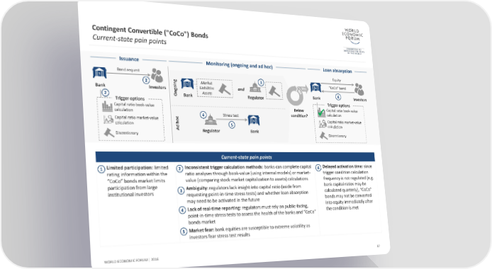 Contingent Convertible ("CoCo") Bonds Current-state pain points Issuance Monitoring (ongoing and ad hoc) Loan absorption Bond request Equity g 3 2 oin Market Yes “CoCo” bond Bank Investors g Liabilities and 6 2 On Bank Assets Regulator Bank Investors Trigger options Trigger options Capital ratio book-value Below Capital ratio book-value calculation calculation c 4 Stress test condition? Capital ratio market-value ho Capital ratio market-value calculation Ad 5 calculation Discretionary Regulator Bank Discretionary Current-state pain points 1 Limited participation: limited 2 Inconsistent trigger calculation methods: banks can complete capital 6 Delayed activation time: since rating information within the ratio analyses through book-value (using internal models) or market- trigger conditioncalculation “CoCo” bonds market limits value (comparing stock market capitalization to assets) calculations frequency is not regulated (e.g. participationfrom large 3 Ambiguity: regulators lack insight into capital ratio (aside from bank capital ratios may be institutional investors requesting point-in-time stress tests) and whether loan absorption calculated quarterly), “CoCo” may need to be activated in the future bonds may not be converted 4 Lack of real-time reporting: regulators must rely on public-facing, into equity immediately after point-in-time stress tests to assess the health of the banks and “CoCo” the condition is met bonds market 5 Market fear: bank equities are susceptible to extreme volatility as investors fear stress test results WORLD ECONOMIC FORUM | 2016 87