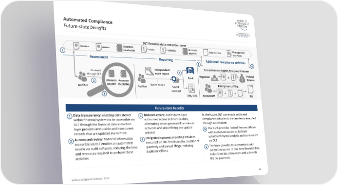 Automated Compliance Future-state benefits DLT financial data extraction layer Income Assets Accounts Losses Liabilities Accounts Depreciation Management receivable payable assertions 1 Assessment Reporting Additional compliance activities 5 6 Independent Comprehensive Capital Assessment Review Accessed audit report 4 Federal through DLT Bank Regulator + Reserve 2 Accounts Accounts Auditor payable receivable Auditor Stored on DLT Smart Enterprise tax filing contract + + 3 10K/10Q Accountant IRS Future-state benefits 1 Data transparency: enabling data stored 3 Reduced errors: audit teams have In the future, DLT can enable additional within financial systems to be accessible via authorizedaccess to financial data, compliance activities to be seamlessly executed DLT through the financial data extraction eliminating errors generated by manual through automation: layer provides immutable and transparent activities and streamlining the update • The bank provides Federal Reserve officials records that are updated in real time process 5 with authorized access to facilitate 2 Automated review: financialinformation 4 Integrated systems: reporting activities automated capital analysis and store results accessible via DLT enables an automated executed via DLT facilitates the creation of on DLT review via audit software, reducing the time quarterly and annual filings, reducing • Thebank provides tax accountants with and resources required to perform these duplicate efforts 6 authorized access to real-time financial data activities to facilitate tax calculations and automate IRS tax payments WORLD ECONOMIC FORUM | 2016 98