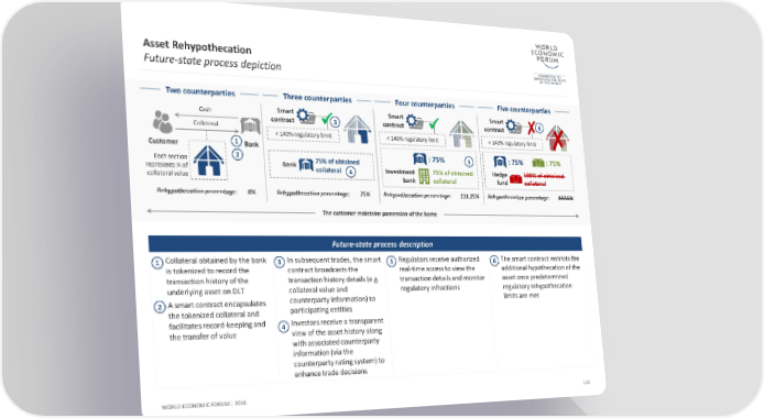 Asset Rehypothecation Future-state process depiction Two counterparties Three counterparties Four counterparties Five counterparties Cash Smart Smart Smart 6 contract 3 contract contract ✘ Collateral < 140% regulatory limit < 140% regulatory limit < 140% regulatory limit ✘ Customer 1 Bank Each section 2 75% of obtained : 75% 5 : 75% : 75% represents ¼ of Bank collateral 4 Investment 75% of obtained Hedge 100% of obtained collateral value bank collateral fund collateral Rehypothecation percentage: 0% Rehypothecation percentage: 75% Rehypothecation percentage: 131.25% Rehypothecation percentage: 187.5% The customer maintains possession of the home Future-state process description 1 Collateral obtained by the bank 3 In subsequent trades, the smart 5 Regulators receive authorized 6 The smart contract restricts the is tokenized to record the contract broadcasts the real-time access to view the additionalhypothecation of the transaction history of the transaction history details (e.g. transaction details and monitor asset once predetermined underlying asset on DLT collateral value and regulatory infractions regulatory rehypothecation 2 A smartcontract encapsulates counterparty information) to limits are met the tokenized collateral and participating entities facilitates record-keeping and 4 Investors receive a transparent the transfer of value view of the asset history along with associated counterparty information (via the counterparty rating system) to enhance trade decisions WORLD ECONOMIC FORUM | 2016 115