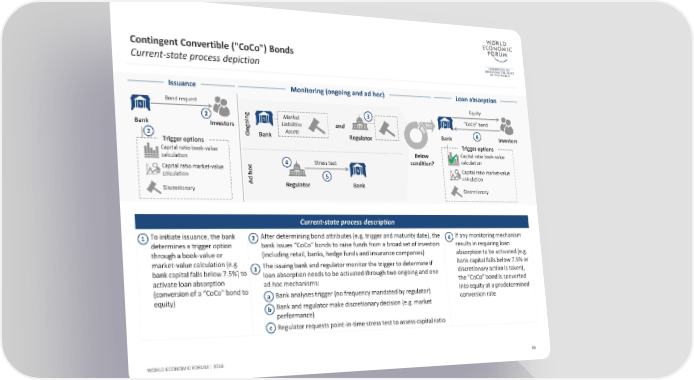 Contingent Convertible ("CoCo") Bonds Current-state process depiction Issuance Monitoring (ongoing and ad hoc) Loan absorption Bond request Equity g 3 2 oin Market Yes “CoCo” bond Bank Investors g Liabilities and 6 2 On Bank Assets Regulator Bank Investors Trigger options Trigger options Capital ratio book-value Below Capital ratio book-value calculation calculation c 4 Stress test condition? Capital ratio market-value ho Capital ratio market-value calculation Ad 5 calculation Discretionary Regulator Bank Discretionary Current-state process description 1 To initiate issuance, the bank 2 After determining bond attributes (e.g. trigger and maturity date), the 4 If any monitoringmechanism determines a trigger option bank issues “CoCo” bonds to raise funds from a broad set of investors results in requiring loan through a book-value or (including retail, banks, hedge funds and insurance companies) absorption to be activated (e.g. market-value calculation(e.g. 3 The issuing bank and regulator monitor the trigger to determine if bank capital falls below 7.5% or bank capital falls below 7.5%) to loan absorption needs to be activated through two ongoing and one discretionary action is taken), activate loan absorption ad hoc mechanisms: the “CoCo” bond is converted (conversion of a “CoCo” bond to - Bank analyses trigger (no frequency mandated by regulator) into equity at a predetermined equity) a conversion rate - Bank and regulator make discretionary decision (e.g. market b performance) - Regulator requests point-in-time stress test to assess capital ratio c WORLD ECONOMIC FORUM | 2016 86