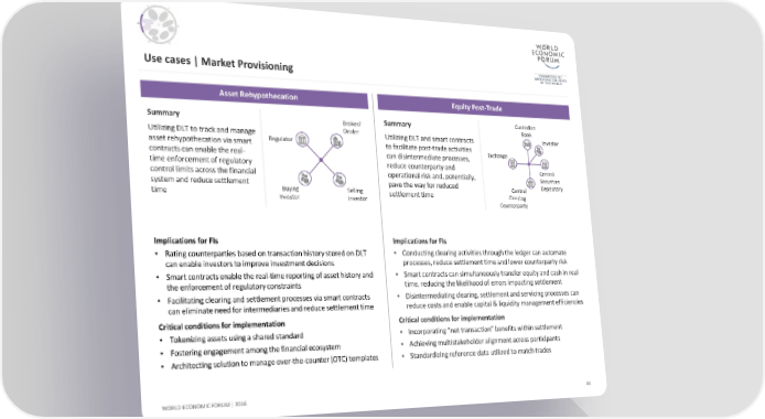 Use cases | Market Provisioning Asset Rehypothecation Equity Post-Trade Summary Broker/ Summary Custodian Dealer Bank Utilizing DLT to track and manage Utilizing DLT and smart contracts Investor asset rehypothecation via smart Regulator to facilitate post-trade activities contracts can enable the real- can disintermediate processes, Exchange time enforcement of regulatory reduce counterparty and Central control limits across the financial operational risk and, potentially, Securities system and reduce settlement Buying pave the way for reduced Central Depository time Selling settlement time Clearing Investor Investor Counterparty Implications for FIs Implications for FIs • Rating counterparties based on transaction history stored on DLT • Conducting clearing activities through the ledger can automate can enable investors to improve investment decisions processes, reduce settlement time and lower counterparty risk • Smart contracts enable the real-time reporting of asset history and • Smart contracts can simultaneously transfer equity and cash in real the enforcement of regulatory constraints time, reducing the likelihood of errors impacting settlement • Facilitating clearing and settlement processes via smart contracts • Disintermediating clearing, settlement and servicing processes can can eliminate need for intermediaries and reduce settlement time reduce costs and enable capital & liquidity management efficiencies Critical conditions for implementation Critical conditions for implementation • Tokenizing assets using a shared standard • Incorporating “net transaction” benefits within settlement • Fostering engagement among the financial ecosystem • Achieving multistakeholder alignment across participants • Architecting solution to manage over-the-counter (OTC) templates • Standardizing reference data utilized to match trades WORLD ECONOMIC FORUM | 2016 44