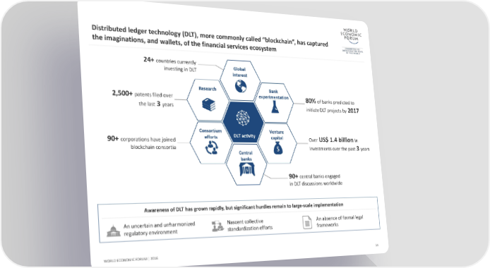 Distributed ledger technology (DLT), more commonly called “blockchain”, has captured the imaginations, and wallets, of the financial services ecosystem 24+countries currently Global investing in DLT interest Research Bank 2,500+ patents filed over experimentation 80% of banks predicted to the last 3 years initiate DLT projects by 2017 Consortium DLT activity Venture 90+ corporations have joined efforts capital Over US$ 1.4 billion in blockchain consortia Central investments over the past 3 years banks 90+central banks engaged in DLT discussions worldwide Awareness of DLT has grown rapidly, but significant hurdles remain to large-scale implementation An uncertain and unharmonized Nascent collective An absence of formal legal regulatory environment standardization efforts frameworks WORLD ECONOMIC FORUM | 2016 14
