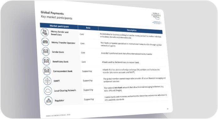 Global Payments Key market participants Market participant Role Description Money Sender and Core An individual or business wishing to transfer money (sender) to another individual Beneficiary or business (beneficiary) internationally Money TransferOperator Core Non-bank companies specialized in international money transfer through a global network of agents Sender Bank Core A sender’s preferred bank that offers international money transfer Beneficiary Bank Core A bank used by the beneficiary to receive funds Correspondent Bank Supporting A bank that has access to foreign exchange (FX) corridors and facilitates the transfer (via nostro accounts and SWIFT) SWIFT Supporting The global member-owned cooperative provider of secure financial messaging and settlement services Local Clearing Network Supporting The national interbank network that allow financial messaging/settlement (e.g. ACH, SPBand Zengin) Regulator Supporting Central banks and monetary authorities that determine and monitor adherence to KYC and AML standards WORLD ECONOMIC FORUM | 2016 48
