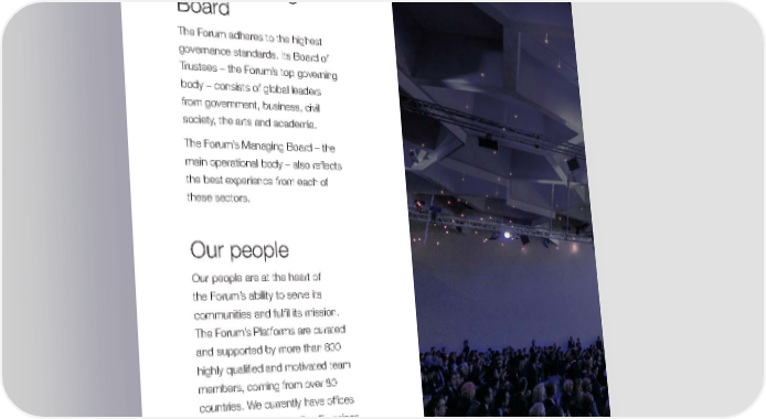 ho we are šoard of Trustees and €anaging šoard The orum adheres to the highest governance standards Its šoard of Trustees – the orum’s top governing body – consists of global leaders from government, business, civil society, the arts and academia The orum’s €anaging šoard – the main operational body – also reflects the best e–perience from each of these sectors Our people Our people are at the heart of the orum’s ability to serve its communities and fulfil its mission The orum’s latforms are curated and supported by more than ¡‡‡ highly ‘ualified and motivated team members, coming from over ¡‡ countries e currently have offices in ’eneva, New “or, ‰an rancisco, Toyo, šei…ing and €umbai 16 17