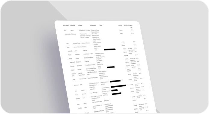 First Name Last Name Position Organization Email Country Industry sector Regis date Edi Rama Prime Minister of Albania Office of the Prime Albania 21-11- Minister of Albania Abdelmadjid Tebboune President of the Office of the Algeria 05-12- Democratic and People's President of the Republic of Algeria Democratic and People's Republic of Algeria Vera Daves de Sousa Minister of Finance Ministry of Finance Angola 24-10- of Angola Jose de Lima Massano Governor National Bank of Angola 16-11- Angola Aguinaldo Jaime Chairman Unitel Angola DC-Digital 19-10- Communications Martin Eurnekian Chief Executive Officer Corporación América Argentina AT-Aviation 03-11- International &Travel Sergio Massa Minister of Economy Ministry of Economy Argentina 24-11- of Argentina Alejandro P. Bulgheroni Chairman Pan American Argentina OGI-Oil & Gas 04-09- Energy Independent Marcos Bulgheroni Chief Executive Officer Pan American Argentina OGI-Oil & Gas 03-09- Energy Independent Gaston Irigoyen Chief Executive Officer Pomelo Argentina NA-Not 28-09- and Co-Founder Applicable Gregorio Werthein Chief Executive Officer Replay Acquisition Argentina 16-11- Delia Ferreira Rubio Chair Transparency Argentina 19-10- International Peter Holmes à Court Special Correspondent Australian Financial Australia ME-Media, 26-10- Review Entertainment and Sport Genevieve Bell Distinguished Professor; Australian National Australia Universities / 19-10- Director, School of University Schools Cybernetics Julie Bishop Chancellor Australian National Australia Universities / 30-11- University Schools Brian Schmidt Vice-Chancellor Australian National Australia Universities / 16-11- University Schools Caroline Cox Chief Legal, Governance BHP Group Australia MM-Mining & 15-11- and External Affairs Metals Officer Mike Henry Chief Executive Officer BHP Group Australia MM-Mining & 11-11- Metals Timothy Ayres Assistant Minister for Department of Australia 30-11- Trade Foreign Affairs and Trade of Australia Andrew Forrest Chairman and Founder Fortescue Metals Australia MM-Mining & 04-10- Group Metals Elizabeth Gaines Global Ambassador Fortescue Metals Australia MM-Mining & 17-10- Group Metals Jade Hameister Polar Explorer and None Australia 06-12- Environmental Advocate Julie Inman Grant eSafety Commissioner Office of the eSafety Australia 31-10- Commissioner Naomi Flutter Executive General Wesfarmers Australia RC-Retail, 31-10- Manager, Corporate Consumer Affairs Goods & Lifestyle Michael Schneider Managing Director, Wesfarmers Australia RC-Retail, 25-10- Bunnings Group Consumer Goods & Lifestyle Stefan Reuther Member of the Executive COPA-DATA Austria AM-Advanced 09-11- Board Manufacturing Martin Kotynek Editor-in-Chief Der Standard Austria ME-Media, 06-10- Entertainment and Sport Alexander Schallenberg Federal Minister for Federal Ministry for Austria 18-10- European and European and International Affairs International Affairs of Austria Magnus Brunner Minister of Finance Federal Ministry of Austria 02-12- Finance of Austria Martin Kocher Federal Minister of Federal Ministry of Austria 06-12- Labour and Economy Labour and Economy of Austria Ilham Aliyev President of the Republic Administration of the Azerbaijan 07-11- of Azerbaijan President of the Republic of Azerbaijan Mikayil Jabbarov Minister of Economy Ministry of Economy Azerbaijan 16-11- of Azerbaijan