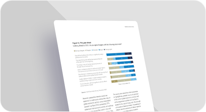 22 Chief Economists Outlook Figure 13. The year ahead Looking ahead to 2023, do you agree/disagree with the following statements? Share of respondents (%) Geopolitical faultlines will continue to significantly realign global economic activity The cost of living crisis will be less severe at the end of the year than at the beginning The energy crisis will be less severe by the end of the year than at the beginning Debt distress in developing economies will have significant spillover effects across global financial markets Further spikes in COVID-19 case numbers will exert a significant drag on global economic activity Crypto disruption will have significant spillover effects across financial markets Labour markets are likely to continue to remain tight in most advanced economies by the end of the year 23 55 23 5 55 23 18 5 41 32 18 5 41 18 41 5 9 23 55 9 23 9 50 18 73 27 Strongly disagree Disagree Uncertain Agree Strongly agree Source: Chief Economists Survey, December 2022 However, geopolitical trends overall are expected to continue to redraw the map of global economic activity: every respondent viewed it as likely (73% somewhat, 27% extremely) that economic activity will continue to reallocate around the world in line with new geopolitical fissures and faultlines. This wider economic impact channels through trade, investment, labour and technology flows, creating myriad challenges and opportunities for business, even as supply chain disruptions are seen to impose a relatively low drag on business activity in the coming year. At the other end of the spectrum, the fall of the cryptocurrency sector is expected to have relatively little spillover into wider financial markets and the majority of chief economists do not expect further economic disruption from COVID-19. Only a quarter of respondents expect debt distress in developing economies to have wider contagion in global financial markets. The survey also asked the chief economists to highlight any potential source of optimism in the current global economic context. Half of the responses touched on three factors related to the cost of living crisis: the strength of household balance sheets, the peaking of inflation and the resilience of labour markets. Results indicate that chief economists expected the outcomes of the latest shocks to have been worse, the impending downturn to be relatively short-lived and the current resilience to form a cornerstone of future recovery. Respondents also highlighted the prospects of a rebound in China following the shift away from zero-COVID policies, economic opportunities in the energy transition and diversified supply chains, relative resilience in some emerging markets, and continued workplace flexibility for knowledge workers. Responses did not indicate signs of optimism about global reintegration and recovery in trade, cementing the impression of a low- growth, low-investment outlook for 2023.