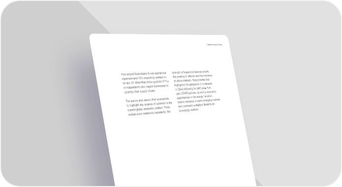 6 Chief Economists Outlook they expect businesses to cut operational expenses and 78% expecting workers to be laid off. More than three-quarters (77%) of respondents also expect businesses to optimize their supply chains. The survey also asked chief economists to highlight any sources of optimism in the current global economic context. Three factors were mentioned repeatedly: the strength of household balance sheets, the peaking of inflation and the resilience of labour markets. Respondents also highlighted the prospects of a rebound in China following the shift away from zero-COVID policies, as well as economic opportunities in the energy transition, relative resilience in some emerging markets and continued workplace flexibility for knowledge workers.