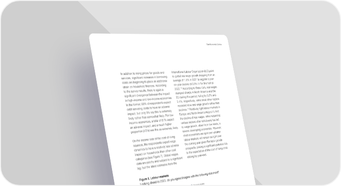 16 Chief Economists Outlook In addition to rising prices for goods and services, significant increases in borrowing costs are beginning to place an additional strain on household finances. According to the survey results, there is again a significant divergence between the impact in high-income and low-income economies. In the former, 68% of respondents expect debt servicing costs to have an adverse impact, but only 9% say this is extremely likely rather than somewhat likely. For low- income economies, a total of 81% expect an adverse impact, and a much higher proportion (45%) see this as extremely likely. On the income side of the cost-of-living squeeze, the respondents expect wage dynamics to have a relatively less adverse impact on households than other cost categories (see Figure 7). Global wages data are patchy and subject to a significant lag, but the latest estimates from the International Labour Organization (ILO) point to global real wage growth dropping from an average of 1.8% in 2021 to register a year- on-year decline of 0.9% in the first half of 2022. 18 According to these data, real wages slumped sharply in North America and the EU during this period, falling by 3.2% and 2.4%, respectively, while most other regions recorded slow real wage growth rather than declines. 19 Relatively tight labour markets in Europe and North America helped to limit the decline of real wages, while reopening various sectors after lockdowns has led to wage growth, albeit from low levels, in several developing economies. However, chief economists are split over whether labour markets will remain as tight over the coming year given the tepid growth prospects, posing a significant potential risk to the expectation of the cost of living crisis ebbing by year-end. Figure 8. Labour markets Looking ahead to 2023, do you agree/disagree with the following statement? 1 1 4 4 Labour markets are likely to continue to remain tight in most advanced economies by the end of the year Share of respondents (%) 41 18 41 Strongly disagree Disagree Uncertain Agree Strongly agree Source: Chief Economists Survey, December 2022 18 ILO, November 2022. 19 Ibid.