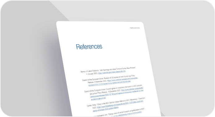 25 Chief Economists Outlook References Bureau of Labor Statistics, “Job Openings and Labor Turnover Survey News Release”, 4 January 2023, https://www.bls.gov/news.release/jolts.htm. Council of the European Union, Russian oil: EU agrees on level of price cap Press Release , 3 December 2022, https://www.consilium.europa.eu/en/press/press- releases/2022/12/03/russian-oil-eu-agrees-on-level-of-price-cap/. Council of the European Union, Council agrees on temporary mechanism to limit excessive gas prices Press Release , 19 December 2022, https://www.consilium.europa.eu/en/ press/press-releases/2022/12/19/council-agrees-on-temporary-mechanism-to-limit- excessive-gas-prices/. Curran, Endy, “China Is the Wild Card for Global Inflation in 2023”, Bloomberg , 7 December 2022, https://www.bloomberg.com/news/articles/2022-12-07/china-covid-zero- policy-will-shape-2023-global-inflation. Economist Intelligence Unit, “Energy crisis will erode Europe’s competitiveness in 2023”, 13 October 2022, https://www.eiu.com/n/energy-crisis-will-erode-europe- competitiveness-in-2023/. Economist Intelligence Unit, Europe outlook 2023 , December 2022a, “The threats to Europe’s industrial competitiveness” , https://www.eiu.com/n/campaigns/europe- outlook-2023/. Economist Intelligence Unit, Asia outlook 2023 , December 2022b, “Mixed prospects for regional heavyweights” , https://www.eiu.com/n/campaigns/asia-outlook-2023/. European Central Bank, Opinion of the European Central Bank on a proposal for a Council regulation establishing a market correction mechanism to protect citizens and the economy against excessively high prices (CON/2022/44), 2 December 2022, https:// www.ecb.europa.eu/pub/pdf/other/en_con_2022_44_f_sign~6183314e58.en.pdf. European Central Bank, “Inflation perceptions and expectations”, 7 December 2022, https://www.ecb.europa.eu/stats/ecb_surveys/consumer_exp_survey/results/html/ ecb.ces_results_december_2022_inflation.en.html#_Inflation_expectations_three.