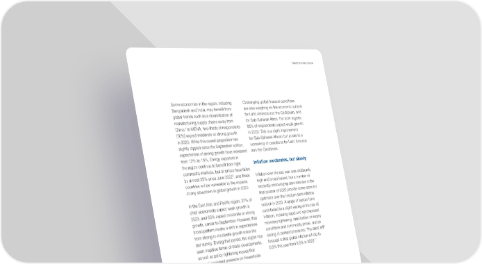 9 Chief Economists Outlook Some economies in the region, including Bangladesh and India, may benefit from global trends such as a diversification of manufacturing supply chains away from China. 4 In MENA, two-thirds of respondents (70%) expect moderate or strong growth in 2023. While this overall proportion has slightly dipped since the September edition, expectations of strong growth have increased from 12% to 15%. Energy exporters in the region continue to benefit from tight commodity markets, but oil prices have fallen by almost 25% since June 2022 5 , and these countries will be vulnerable to the impacts of any slowdown in global growth in 2023. In the East Asia and Pacific region, 37% of chief economists expect weak growth in 2023, and 63% expect moderate or strong growth, similar to September. However, that broad pattern masks a shift in expectations from strong to moderate growth since the last survey. During that period, the region has seen negative terms-of-trade developments, as well as policy tightening moves that placed increased pressure on households and businesses. 6 Challenging global financial conditions are also weighing on the economic outlook for Latin America and the Caribbean, and for Sub-Saharan Africa. For both regions, 68% of respondents expect weak growth in 2023. This is a slight improvement for Sub-Saharan African but points to a worsening of conditions for Latin America and the Caribbean. Inflation moderates, but slowly Inflation over the last year was stubbornly high and broad-based, but a number of modestly encouraging data releases in the final quarter of 2022 provide some room for optimism over the medium-term inflation outlook in 2023. A range of factors have contributed to a slight easing of the rate of inflation, including rapid and synchronized monetary tightening, stabilization of supply conditions and commodity prices, and an easing of demand pressures. The latest IMF forecast is that global inflation will dip to 6.5% this year from 8.8% in 2022. 7 3 IMF, October 2022a. 4 Economist Intelligence Unit, December 2022b. 5 Based on World Bank Monthly Commodity prices, November 2022. 6 IMF, October 2022a. 7 Ibid.