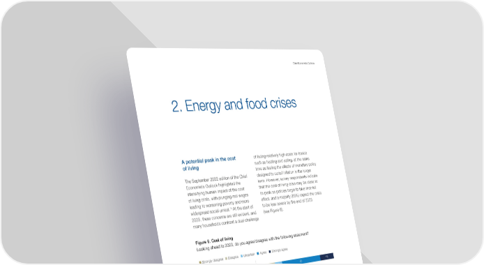 14 Chief Economists Outlook 2. Energy and food crises A potential peak in the cost of living The September 2022 edition of the Chief Economists Outlook highlighted the intensifying human impact of the cost of living crisis, with plunging real wages leading to worsening poverty and more widespread social unrest. 14 At the start of 2023, these concerns are still evident, and many households confront a dual challenge of facing relatively high costs for basics such as heating and eating, at the same time as feeling the effects of monetary policy designed to curtail inflation in the longer term. However, survey respondents indicate that the cost of living crisis may be close to its peak as policies begin to take their full effect, and a majority (68%) expect the crisis to be less severe by the end of 2023 (see Figure 6). However, the continuing impact of the cost of living crisis should not be underestimated. A majority of respondents are of the view that energy and food costs will continue to have an adverse impact on households in both high- and low-income countries throughout 2023 (see Figure 7). Looking at global consumer price inflation data, the food and energy categories recorded the sharpest price increases in 2022, pushed up by a confluence of factors including war, multiple supply chain shocks and commodity market disruption. Figure 6. Cost of living Looking ahead to 2023, do you agree/disagree with the following statement? 1144 The cost of living crisis will be less severe at the end of the year than at the beginning Strongly disagreeDisagree Uncertain Agree Strongly agree Share of respondents (%) 23 9 50 18 Source: Chief Economists Survey, December 2022 14 W orld Economic Forum, September 2022.