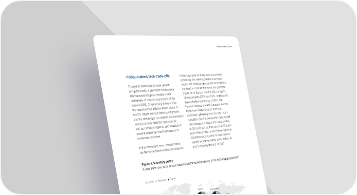 11 Chief Economists Outlook Policy-makers face trade-offs The global backdrop of weak growth and persistently high (albeit moderating) inflation presents policy-makers with challenges of historic proportions at the start of 2023. Chief among these will be the need to bring inflation much closer to the 2% target without choking off growth, but the challenges run deeper. Accumulated societal strains from the last years as well as climate mitigation and adaptation present pressing investment needs in numerous countries. In the immediate term, central banks are the key economic decision-makers. F ollowing a year of sharp and coord inated tightening, the c hief economists su rveyed expect the moneta ry policy stance t o remain constant in most of the world thi s year (see Figure 4). In Europe and the US, a majority of respondents (59% and 55%, re spec tively) expect further ti ghtening in 2023. The Federal Reserve a nd the European Cent ral Bank have both in dicated that su ch additional tight ening is on the way, but it is notable that th e two banks’ mos t recent rate increases i n December were smalle r, at 50 basis points , than previous 75 basis point hikes in the current tightening cycle. Nonetheless, a q uarter of respon dents expect looser monetary policy in the US and Europe by the end of 2023. Figure 4. Monetary policy A year from now, what is your expectation for monetary policy in the following geographies? United States Latin America and the Caribbean Europe East Asia and Pacific South Asia Middle East and North Africa Looser The same Tighter 53 Sub-Saharan Africa 81 China 53 Central Asia 7 80 13 20 67 13 13 69 19 6 71 24 7 80 13 27 14 59 28 56 17 27 18 55 50 40 10 Source: Chief Economists Survey, December 2022