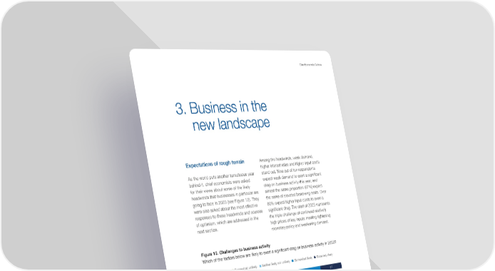 20 Chief Economists Outlook 3. Business in the new landscape Expectations of rough terrain As the world puts another tumultuous year behind it, chief economists were asked for their views about some of the likely headwinds that businesses in particular are going to face in 2023 (see Figure 12). They were also asked about the most effective responses to these headwinds and sources of optimism, which are addressed in the next section. Among the headwinds, weak demand, higher interest rates and higher input costs stand out. Nine out of ten respondents expect weak demand to exert a significant drag on business activity this year, and almost the same proportion (87%) expect the same of elevated borrowing costs. Over 60% expect higher input costs to exert a significant drag. The start of 2023 represents the triple challenge of continued relatively high prices of key inputs meeting tightening monetary policy and weakening demand. Figure 12. Challenges to business activity Which of the factors below are likely to exert a significant drag on business activity in 2023? Share of respondents (%) Regulatory and policy uncertainty Supply chain disruptions Talent shortages High input costs High cost of borrowing Weak demand Extremely unlikely Somewhat unlikely Neither likely nor unlikely Somewhat likely Extremely likely 9 14 18 5 18 5 45 27 18 5 45 27 9 50 36 9 18 50 14 55 32 64 27 Source: Chief Economists Survey, December 2022