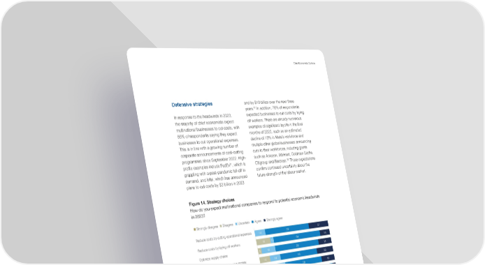 23 Chief Economists Outlook Defensive strategies In response to the headwinds in 2023, the majority of chief economists expect multinational businesses to cut costs, with 86% of respondents saying they expect businesses to cut operational expenses. This is in line with a growing number of corporate announcements of cost-cutting programmes since September 2022. High- profile examples include FedEx 31 , which is grappling with a post-pandemic fall-off in demand, and Intel, which has announced plans to cut costs by $3 billion in 2023 and by $10 billion over the next three years. 32 In addition, 78% of respondents expected businesses to cut costs by laying off workers. There are already numerous examples of significant layoffs in the final months of 2022, such as an estimated decline of 13% in Meta’s workforce and multiple other global businesses announcing cuts to their workforces, including giants such as Amazon, Walmart, Goldman Sachs, Citigroup and Barclays. 33 These expectations confirm continued uncertainty about the future strength of the labour market. Figure 14. Strategy choices How do you expect multinational companies to respond to potential economic headwinds in 2023? Source: Chief Economists Survey, December 2022 Strongly disagree Disagree Uncertain Agree Strongly agree Share of respondents (%) Increase prices to pass on higher costs to consumers Increase investments to improve resilience Reduce prices to maintain or increase market share Increase investments to improve competitiveness Postpone investments to save money Optimize supply chains 32 32 32 5 18 14 50 18 14 14 50 23 45 18 32 5 5 41 41 14 18 5 64 14 Reduce costs by laying off workers 5 18 59 18 Reduce costs by cutting operational expenses 14 59 27 31 FedEx, September 2022; FedEx, December 2022. 32 Intel, October 2022. 33 The Economist, December 2022.