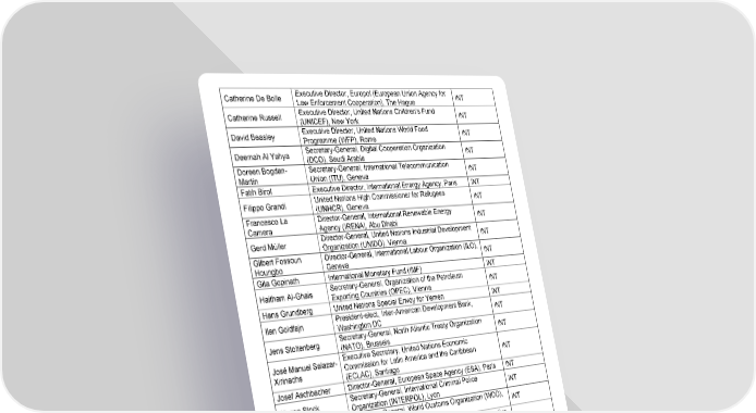 World Economic Forum Annual Meeting , 16 - 20 January 202 3 5 / 12 Catherine De Bolle Executive Director, Europol (European Union Agency for Law Enforcement Cooperation), The Hague INT Catherine Russell Executive Director, United Nations Children's Fund (UNICEF), New York INT David Beasley Executive Director, United Nations World Food Programme (WFP), Rome INT Deemah Al Yahya Secretary - General, Digital Cooperation Organization (DCO), Saudi Arabia INT Doreen Bogdan - Martin Secretary - General, International Telecommunication Union (ITU), Geneva INT Fatih Birol Executive Director, International Energy Agency, Paris INT Filippo Grandi United Nations High Commissioner for Refugees (UNHCR), Geneva INT Francesco La Camera Director - General, International Renewable Energy Agency (IRENA), Abu Dhabi INT Gerd Müller Director - General, United Nations Industrial Development Organization (UNIDO), Vienna INT Gilbert Fossoun Houngbo Director - General, Internationa l Labour Organization (ILO), Geneva INT Gita Gopinath International Monetary Fund (IMF) INT Haitham Al -Ghais Secretary - General, Organization of the Petroleum Exporting Countries (OPEC), Vienna INT Hans Grundberg United Nations Special Envoy for Yemen INT Ilan Goldfajn President - elect, Inter - American Development Bank, Washington DC INT Jens Stoltenberg Secretary - General, North Atlantic Treaty Organization (NATO), Brussels INT José Manuel Salazar - Xirinachs Executive Secretary, United Nations Economic Commission for Latin America and the Caribbean (ECLAC), Santiago INT Josef Aschbacher Director - General, European Space Agency (ESA), Paris INT Jürgen Stock Secretary - General, International Criminal Police Orga nization (INTERPOL), Lyon INT Kunio Mikuriya Secretary - General, World Customs Organization (WCO), Brussels INT Maimunah Mohd Sharif Undersecretary ‐ General of the United Nations; Executive Director, United Nations Human Settlements Programme (UN - HABITAT), Nairobi INT Mathias Cormann Secretary - General, Organisation for Economic Co - operation and Development (OECD), Paris INT Mirjana Spoljaric Egger President, International Committee of the Red Cross (ICRC), Geneva INT Natalia Kanem Executive Director, United Nations Population Fund (UNFPA), New York INT Pamela Coke - Hamilton Executive Director, International Trade Centre (ITC), Geneva INT Peter Thomson United Nations Secretary - General's Special Envoy for the Ocean INT Rebeca Grynspan Secretary - General, United Nations Conference on Trade and Development (UNCTAD), Geneva INT Tatiana Valovaya Director - General, United Nations Geneva (UNOG), Geneva INT Tedros Adhanom Ghebreyesus Director - General, World Health Organization (WHO), Geneva INT