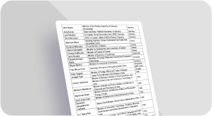 World Economic Forum Annual Meeting , 16 - 20 January 202 3 4 / 12 Jens Spahn Member of the Federal Assembly of Germany (Bundestag) Germany Jörg Kukies State Secretary, Federal Chancellery of Germany Germany Lars Klingbeil Co - Leader, Social Democratic Party (SPD), Germany Germany Omid Nouripour Party Co - Leader, Alliance 90/The Greens, Germany Germany Wamkele Mene Secretary - General, African Continental Free Trade Area Secretariat, Accra Ghana Kyriakos Mitsotakis Prime Minister of Greece Greece Adonis Georgiadis Minister for Development and Investment of Greece Greece Christos Staikouras Minister of Finance of Greece Greece Janio Rosales Minister of Economy of Guatemala Guatemala Eduardo Enrique Reina Secretary of Foreign Affairs and International Cooperation of Honduras Honduras Miguel Medina Minister of Investments of Honduras Honduras Paul Mo -po Chan Secretary of Finance of Hong Kong SAR, China Hong Kong SAR, China Péter Szijjártó Minister of Foreign Affairs and Trade of Hungary Hungary Amitabh Kant Indian Prime Minister's G20 Sherpa of India India Ashwini Vaishnaw Minister of Railways; Minister of Communications; and Minister of Electronics and Information Technology of India India Mansukh Mandaviya Minister of Health and Family Welfare; and Minister of Chemicals and Fertilisers of India India Raj Kumar Singh Minister of Power; and Minister of New and Renewable Energy of India India Smriti Zubin Irani Minister of Women and Child Development of India India Devendra Gangadharrao Fadnavis Deputy Chief Minister, Government of Maharashtra, India India K T Rama Rao Minister of Information Technology, Industries, Municipal Administration and Urban Development of Telangana, India India Thangam Thennarasu Minister for Industries, Tamil Official Language and Tamil Culture, Archaeology, Government of Tamil Nadu, India India Basavaraj S Bommai Chief Minister of Karnataka, India India Eknath Sambhaji Shinde Chief Minister of Maharashtra, India India Yogi Adityanath Chief Minister, Government of Uttar Pradesh, India India Arifin Tasrif Minister of Energy and Mineral Resources of Indonesia Indonesia Bahlil Lahadalia Minister of Investment of Indonesia Indonesia Luhut B. Pandjaitan Coordinating Minister for Maritime Affairs and Investment of Indonesia Indonesia Máxima of the Netherlands Queen of the Netherlands; United Nations Secretary - General's Special Advocate for Inclusive Finance INT António Guterres Secretary - General, United Nations, USA INT Kristalina Georgieva International Monetary Fund (IMF) INT Ngozi Okonjo -Iweala Director - General, World Trade Organization (WTO), Geneva INT Achim Steiner Administrator, United Nations Development Programme (UNDP), New York INT Alvaro Lario President, International Fund for Agricultural Development (IFAD), Rome INT