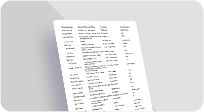 2022 - Annual Meeting 33 / 41 Alexey Yakovitskiy Global Chief Executive Officer VTB Capital Russian Federation Makram Abboud Vice - Chairman, International VTB Capital United Kingdom Doug McMillon President and Chief Executive Officer Walmart Inc. USA Judith McKenna President and Chief Executive Officer, Walmart International Walmart Inc. USA Jeremy Farrar Director Wellcome Trust United Kingdom Rob Scott Chief Executive Officer Wesfarmers Limited Australia Cynthia Tregillis Senior Vice - President and Deputy General Counsel Western Digital Corp. USA Laura Alber President and Chief Executive Officer Williams - Sonoma USA Anne Pullum Chief Executive Officer, Europe Willis Towers Watson United Kingdom Carl Hess Chief Executive Officer Willis Towers Watson USA Julie Gebauer Chief Executive Officer, Health, Wealth and Career Willis Towers Watson USA Pamela Thomson - Hall Chief Executive Officer, International and Chief Executive Officer, Risk and Broking International Willis Towers Watson United Kingdom Pierre Bruno Chief Executive Officer, Europe Wipro Limited France Rishad Premji Executive Chairman Wipro Limited India Stephanie Trautman Chief Growth Officer Wipro Limited USA Subha Tatavarti Chief Technology Officer Wipro Limited USA Thierry Delaporte Chief Executive Officer and Managing Director Wipro Limited France Gideon Lichfield Global Editorial Director Wired Magazine USA Chano Fernandez Co - Chief Executive Officer Workday Inc. United Kingdom Adrian Lovett President and Chief Executive Officer World Wide Web Foundation USA Igor Tulchinsky Founder, Chairman and Chief Executive Officer WorldQuant LLC USA Mark Read Chief Executive Officer WPP Plc United Kingdom Marco Lambertini Director - General WWF International Switzerland Arkady Volozh Chief Executive Officer Yandex LLC Netherlands Tigran Khudaverdian Deputy Chief Executive Officer Yandex LLC Russian Federation Arne Cartridge Special Adviser, Strategy and Business Development Yara International ASA Norway Fernanda Lopes Larsen Executive Vice - President, Africa and Asia Yara International ASA Norway Magnus Ankarstrand President, Clean Ammonia Yara International ASA Norway Mónica Andrés Executive Vice - President, Europe, Corporate Management Yara International ASA Norway Svein Tore Holsether President and Chief Executive Officer Yara International ASA Norway Nicola Galombik Executive Director Yellowwoods Holdings Sarl South Africa Murat Ülker Chairman and Member of the Board Yildiz Holding Turkey Susan Wojcicki Chief Executive Officer YouTube Inc. USA Cornelis van Zadelhoff Founder Zadelhoff Beheer BV Netherlands Jim Ovia Chairman Zenith Bank Plc Nigeria Wolf - Henning Scheider Chairman of the Board of Management and Chief Executive Officer ZF Friedrichshafen AG Germany Ankiti Bose Co - Founder and Chief Executive Officer Zilingo Pte Ltd Singapore Eric Yuan Founder and Chief Executive Officer Zoom Video Communications, Inc. USA Harry Moseley Global Chief Information Officer Zoom Video Communications, Inc. USA