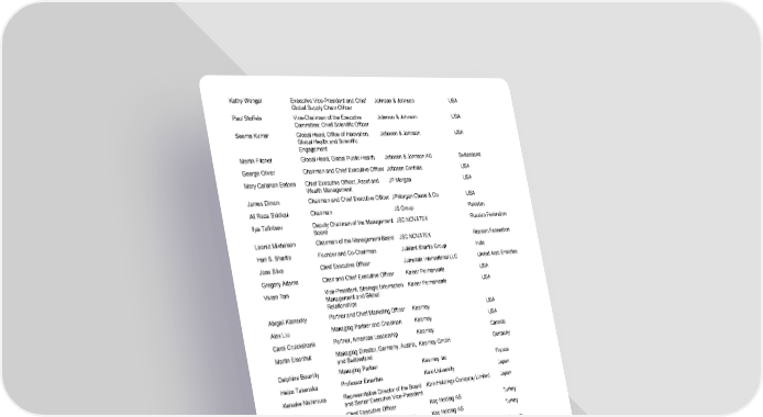 2022 - Annual Meeting 17 / 41 Kathy Wengel Executive Vice - President and Chief Global Supply Chain Officer Johnson & Johnson USA Paul Stoffels Vice - Chairman of the Executive Committee; Chief Scientific Officer Johnson & Johnson USA Seema Kumar Global Head, Office of Innovation, Global Health and Scientific Engagement Johnson & Johnson USA Martin Fitchet Global Head, Global Public Health Johnson & Johnson AG Switzerland George Oliver Chairman and Chief Executive Officer Johnson Controls USA Mary Callahan Erdoes Chief Executive Officer, Asset and Wealth Management JP Morgan USA James Dimon Chairman and C hief Executive Officer JPMorgan Chase & Co. USA Ali Raza Siddiqui Chairman JS Group Pakistan Ilya Tafintsev Deputy Chairman of the Management Board JSC NOVATEK Russian Federation Leonid Mikhelson Chairman of the Management Board JSC NOVATEK Russian Federation Hari S. Bhartia Founder and Co - Chairman Jubilant Bhartia Group India Jose Silva Chief Executive Officer Jumeirah International LLC United Arab Emirates Gregory Adams Chair and Chief Executive Officer Kaiser Permanente USA Vivian Tan Vice - President, Strategic Information Management and Global Relationships Kaiser Permanente USA Abigail Klanecky Partner and Chief Marketing Officer Kearney USA Alex Liu Managing Partner and Chairman Kearney USA Carol Cruickshank Partner, Americas Leadership Kearney Canada Martin Eisenhut Managing Director, Germany, Austria, and Switzerland Kearney GmbH Germany Delphine Bourrilly Managing Partner Kearney Inc. France Heizo Takenaka Professor Emeritus Keio University Japan Keisuke Nishimura Representative Director of the Board and Senior Executive Vice - President Kirin Holdings Company Limited Japan Levent Cakiroglu Chief Executive Officer Koç Holding AS Turkey Melih Poyraz Director, Strategy and Business Development Koç Holding AS Turkey Bill Thomas Global Chairman and Chief Executive Officer KPMG International Services Limited Canada André Kudelski Chairman of the Board and Chief Executive Officer Kudelski Group Switzerland Tetsuji Ida Senior Staff Writer and Editorial Writer Kyodo News Japan Frédéric Lelièvre Chief Executive Officer and Editor - in - Chief L'Agefi Switzerland Sadanobu Takemasu President and Chief Executive Officer, Representative Director and Chairman of the Board Lawson Inc. Japan Anne Clarke Wolff Chief Executive Officer, Independence Point Advisors Lazard USA Jean - Louis Girodolle Chief Executive Officer, I nvestment Banking, France Lazard France Jeffrey Allen Rosen Deputy Chairman Lazard USA Kenneth M. Jacobs Chairman of the Board of Directors and Chief Executive Officer Lazard USA Peter Orszag Chief Executive Officer, Financial Advisory Lazard USA Fabrice Node - Langlois Editor - in - Chief, International Economics Le Figaro France Clay Heskett Global Managing Partner LEK Consulting Group United Kingdom