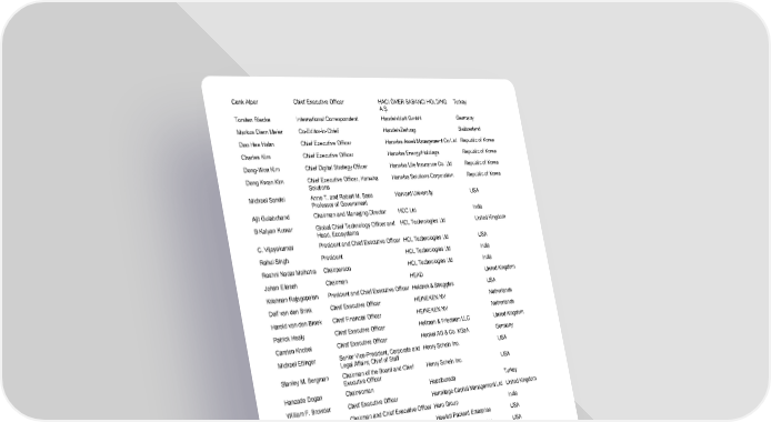 2022 - Annual Meeting 13 / 41 Cenk Alper Chief Executive Officer HACI ÖMER SABANCI HOLDİNG A.Ş. Turkey Torsten Riecke International Correspondent Handelsblatt GmbH Germany Markus Diem Meier Co - Editor - in - Chief HandelsZeitung Switzerland Doo Hee Hahn Chief Executive Officer Hanwha Asset Management Co Ltd Republic of Korea Charles Kim Chief Executive Officer Hanwha Energy/Holdings Republic of Korea Dong - Won Kim Chief Digital Strategy Officer Hanwha Life Insurance Co. Ltd Republic of Korea Dong Kwan Kim Chief Executive Officer, Hanwha Solutions Hanwha Solutions Corporation Republic of Korea Michael Sandel Anne T. and Robert M. Bass Professor of Government Harvard University USA Ajit Gulabchand Chairman and Managing Director HCC Ltd India B Kalyan Kumar Global Chief Technology Officer and Head, Ecosystems HCL Technologies Ltd United Kingdom C. Vijayakumar President and Chief Executive Officer HCL Technologies Ltd USA Rahul Singh President HCL Technologies Ltd India Roshni Nadar Malhotra Chairperson HCL Technologies Ltd India Johan Eliasch Chairman HEAD United Kingdom Krishnan Rajagopalan President and Chief Executive Officer Heidrick & Struggles USA Dolf van den Brink Chief Executive Officer HEINEKEN NV Netherlands Harold van den Broek Chief Financial Officer HEINEKEN NV Netherlands Patrick Healy Chief Executive Officer Hellman & Friedman LLC United Kingdom Carsten Knobel Chief Executive Officer Henkel AG & Co. KGaA Germany Michael Ettinger Senior Vice - President, Corporate and Legal Affairs; Chief of Staff Henry Schein Inc. USA Stanley M. Bergman Chairman of the Board and Chief Executive Officer Henry Schein Inc. USA Hanzade Dogan Chairwoman Hepsiburada Turkey William F. Browder Chief Executive Officer Hermitage Capital Management Ltd United Kingdom Pawan Munjal Chairman and Chief Executive Officer Hero Group India Ann Ewasechko Director, Corporate Affairs Hewlett Packard Enterprise USA Antonio Neri President and Chief Executive Officer Hewlett Packard Enterprise USA John Schultz Executive Vice - President and Chief Operating Officer Hewlett Packard Enterprise USA Mazen S. Darwazeh Executive Vice - Chairman; President, Middle East and North Africa Hikma Pharmaceuticals LLC Jordan Kenneth Goldman President Hillspire USA Claudio Facchin President and Chief Executive Officer Hitachi Energy Switzerland Alistair Dormer Chief Environmental Officer and Executive Vice - President; Chairman, Hitachi Europe Hitachi Ltd Japan Keiji Kojima President and Chief Operating Officer Hitachi Ltd Japan Lorena Dellagiovanna Vice - President and Executive Officer; CDIO, Deputy Chief Enviro nmental Officer, Deputy General Manager, Government and External Relations Group Hitachi Ltd Japan Toshiaki Higashihara Executive Chairman and Chief Executive Officer Hitachi Ltd Japan Stephen P. MacMillan Chairman, President and Chief Executive Officer Hologic Inc. USA Jeff Huber Chief Executive Officer Home Instead Inc. USA Toshiaki Mikoshiba Chairman of the Board Honda Motor Co. Ltd Japan