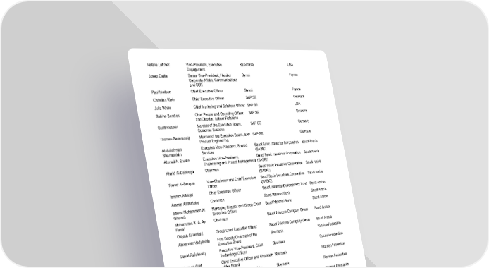 2022 - Annual Meeting 26 / 41 Natalia Latimer Vice - President, Executive Engagement Salesforce USA Josep Catlla Senior Vice - President; Head of Corporate Affairs, Communications and CSR Sanofi France Paul Hudson Chief Executive Officer Sanofi France Christian Klein Chief Executive Officer SAP SE Germany Julia White Chief Marketing and Solutions Officer SAP SE USA Sabine Bendiek Chief People and Operating Officer and Director, Labour Relations SAP SE Germany Scott Russell Member of the Executive Board, Customer Success SAP SE Germany Thomas Saueressig Member of the Executive Board, SAP Product Engineering SAP SE Germany Abdulrahman Shamsaddin Executive Vice - President, Shared Services Saudi Basic Industries Corporation (SABIC) Saudi Arabia Ahmed Al - Shaikh Executive Vice - President, Engineering and Project Management Saudi Basic Industries Corporation (SABIC) Saudi Arabia Khalid Al Dabbagh Chairman Saudi Basic Industries Corporation (SABIC) Saudi Arabia Yousef Al - Benyan Vice - Chairman and Chief Executive Off icer Saudi Basic Industries Corporation (SABIC) Saudi Arabia Ibrahim AlMojel Chief Executive Officer Saudi Industrial Development Fund Saudi Arabia Ammar Alkhudairy Chairman Saudi National Bank Saudi Arabia Saeed Mohammed Al Ghamdi Managing Director and Group Chief Executive Officer Saudi National Bank Saudi Arabia Mohammed K. A. Al - Faisal Chairman Saudi Telecom Company Group Saudi Arabia Olayan Al - Wetaid Group Chief Executive Officer Saudi Telecom Company Group Saudi Arabia Alexander Vedyakhin First Deputy Chairman of the Executive Board Sberbank Russian Federation David Rafalovsky Executive Vice - President, Chief Technology Officer Sberbank Russian Federation Herman Gref Chief Executive Officer and Chairman of the Board Sberbank Russian Federation Lev Khasis First Deputy Chairman of the Executive Board Sberbank Russian Federation Stanislav Kuznetsov Deputy Chairman of the Executive Board Sberbank Russian Federation Yulia Chupina Senior Vice - President Sberbank Russian Federation Christel Heydemann Executive Vice - President, Europe Operations Schneider Electric SE France Jean - Pascal Tricoire Chairman and Chief Executive Officer Schneider Electric SE France Luc Remont Executive Vice - President Schneider Electric SE France Sandrine de Guio Global Vice - President; Software business, Energy Management; advisor to the chairman and CEO Schneider Electric SE Hong Kong SAR, China Barbara Frei Executive Vice - President and Chief Executive Officer, Industrial Automation Schneider Electric Switzerland AG Switzerland Ted Doheny Chief Executive Officer Sealed Air Corp. USA Hasan Al Jabri Chief Executive Officer SEDCO Holding Saudi Arabia Iqbal Survé Executive Chairman Sekunjalo Investment Holdings South Africa Jeffrey Martin Chairman and Chief Executive Officer Sempra Energy USA Lisa Alexander Senior Vice - President and Chief Sustainability Officer Sempra Energy USA Ambrosie Bryant Chukwueloka Orjiako Chairman Seplat Petroleum Development Company Plc Nigeria