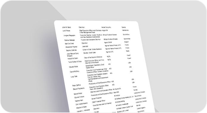 2022 - Annual Meeting 2 / 41 John M. Beck Chairman Aecon Group Inc. Canada Lard Friese Chief Executive Officer and Chairman of the Management Board Aegon NV Netherlands Jongisa Magagula Executive Director, Investor Relations and New Business Development African Rainbow Minerals South Africa Patrice Motsepe Founder and Executive Chairman African Rainbow Minerals South Africa Bart De Smet Chairman Ageas SA/NV Belgium Alexander Pigman Journalist Agence France Presse (AFP) France Sophie Estienne Editor - in - Chief, Global Business Agence France Presse (AFP) France Jose Manuel Sanz Mingote Director, Chief Editor Agencia EFE Spain Henadi Al Saleh Chair of the Board of Directors Agility Kuwait Tarek Sultan Al Essa Chief Executive Officer and Vice - Chairman of the Board Agility Kuwait Claude Wade Global Head, Operations; Chief Digital Officer AIG USA David McElroy Executive Vice - President and Chief Executive Officer, General Insurance AIG USA Lucy Fato Executive Vice - President; General Counsel; Global Head, Communications and Government Affairs AIG USA Peter Zaffino President and Chief Executive Officer AIG USA Shane Fitzsimons Executive Vice - President; Global Head, AIG Operations AIG USA Benoit Potier Chairman and Chief Executive Officer Air Liquide SA France Øyvind Eriksen President and Chief Executive Officer Aker ASA Norway Nadine Hani Senior Presenter Al Arabiya United Arab Emirates Dirk Vanderbroeck Chief Financial Officer Al Dabbagh Group Holding Co. Ltd Saudi Arabia Khadim Al Darei Vice - Chairman and Co - Founder Al Dahra Holding United Arab Emirates Hussain J. AlNowais Chairman Al Nowais Investments United Arab Emirates Areije Al Shakar Director Al Waha Venture Capital Fund Bahrain Davide Serra Founder and Chief Executive Officer Algebris (UK) Limited United Kingdom Sami Alangari Vice - Chairman and Chief Executive Officer AlGih az Holding Saudi Arabia Daniel Zhang Chairman and Chief Executive Officer Alibaba Group People's Republic of China Beatrix Morath Managing Director AlixPartners Switzerland Lisa Donahue Managing Director and Member of the Management Committee AlixPartners USA Narry (Narinder) Singh Managing Director AlixPartners United Kingdom Simon Freakley Chief Executive Officer AlixPartners USA Stefano Aversa Global Vice - Chairman and Chairman, Europe, Middle East and Africa AlixPartners United Kingdom Andreas Wimmer Member of the Board of Management Allianz SE Germany Günther Thallinger Member of the Board of Management, Investment Management, Environmental, Social and Governance (ESG) Allianz SE Germany Oliver Bäte Chief Executive Officer Allianz SE Germany Renate Wagner Member of the Board of Management Allianz SE Germany Sirma Boshnakova Chief Executive Officer, Allianz Partners Allianz SE Germany Mohammed Alshaya Executive Chairman Alshaya Group Kuwait Jayadev Galla Chairman Amara Raja Group India