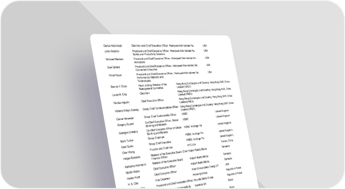 2022 - Annual Meeting 14 / 41 Darius Adamczyk Chairman and Chief Executive Officer Honeywell International Inc. USA John Waldron President and Chief Executive Officer, Safety and Productivity Solutions Honeywell International Inc. USA Michael Madsen President and Chief Executive Officer, Aerospace Honeywell International Inc. USA Que Dallara President and Chief Executive Officer, Connected Enterprise Honeywell International Inc. USA Vimal Kapur President and Chief Executive Officer, Performance Materials and Technologies Honeywell International Inc. USA Bonnie Y Chan Head, Listing; Member of the Management Committee Hong Kong Exchanges and Clearing Limited (HKEX) Hong Kong SAR, China Laura M. C ha Chairman Hong Kong Exchanges and Clearing Limited (HKEX) Hong Kong SAR, China Nicolas Aguzin Chief Executive Officer Hong Kong Exchanges and Clearing Limited (HKEX) Hong Kong SAR, China Victoria Robyn Cowley Group Chief Communications Officer Hong Kong Exchanges and Clearing Limited (HKEX) Hong Kong SAR, China Celine Herweijer Group Chief Sustainability Officer HSBC United Kingdom Gregory Guyett Co - Chief Executive Officer, Global Banking and Markets HSBC United Kingdom Georges Elhedery Co - Chief Executive Officer of Global Banking and Markets HSBC Holdings Plc United Kingdom Mark Tucker Group Chairman HSBC Holdings Plc United Kingdom Noel Quinn Group Chief Executive HSBC Holdings Plc United Kingdom Cher Wang Founder and Chairman HTC - VIA Taiwan, China Holger Eckstein Member of the Executive Board; Chief Financial Officer Hubert Burda Media Germany Katharina Herrmann Member of the Executive Board Hubert Burda Media Germany Martin Weiss Chief Executive Officer Hubert Burda Media Germany Hunter Hunt Chief Executive Officer Hunt Consolidated Energy LP USA H. S. Cho Vice Chairman Hyosung Group Republic of Korea Chi Young Cho President and Chief Innovation Officer Hyundai Motor Group Republic of Korea Agustin Delgado Chief Innovation and Sustainability Officer Iberdrola SA Spain Ignacio S. Galán Chairman and Chief Executive Officer Iberdrola SA Spain Arvind Krishna Chairman and Chief Executive Officer IBM Corporation USA Gary Cohn Vice - Chairman IBM Corporation USA Kate Woolley General Manager, Transformation and Growth Initiatives IBM Corporation USA Mark Foster Senior Vice - President, IBM Services and Global Business Services IBM Corporation USA Rob Thomas Senior Vice - President, Global Markets IBM Corporation USA James Scriven Chief Executive Officer IDB Invest USA Sandy Speicher Chief Executive Officer IDEO USA Ahmet M. Oren Executive Chairman Ihlas Holding SA Turkey Daniel Yergin Vice - Chairman IHS Markit USA Lance Uggla Chairman and Chief Executive Officer IHS Markit United Kingdom Vincent Mattera Chief Executive Officer II - VI Incorporated USA Francis deSouza President and Chief Executive Officer Illumina Inc. USA Andrea Illy Chairman illycaffè SpA Italy Mikaela Jade Founder and Chief Executive Officer Indigital Australia Ronald W. Hovsepian Chief Executive Officer Indigo Agriculture Inc. USA