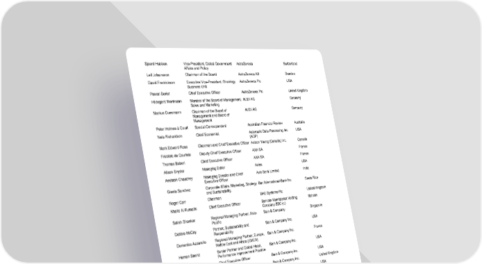2022 - Annual Meeting 4 / 41 Sjoerd Hubben Vice - President, Global Government Affairs and Policy AstraZeneca Switzerland Leif Johansson Chairman of the Board AstraZeneca AB Sweden David Fredrickson Executive Vice - President, Oncology Business Unit AstraZeneca Plc USA Pascal Soriot Chief Executive Officer AstraZeneca Plc United Kingdom Hildegard Wortmann Member of the Board of Management, Sales and Marketing AUDI AG Germany Markus Duesmann Chairman of the Board of Management and Board of Management AUDI AG Germany Peter Holmes à Court Special Correspondent Australian Financial Review Australia Nela Richardson Chief Economist Automatic Data Processing Inc. (ADP) USA Mark Edward Rose Chairman and Chief Executive Officer Avison Young (Canada) Inc. Canada Frédéric de Courtois Deputy Chief Executive Officer AXA SA France Thomas Buberl Chief Executive Officer AXA SA France Alison Snyder Managing Editor Axios USA Amitabh Chaudhry Managing Director and Chief Executive Officer Axis Bank Limited India Gisela Sanchez Corporate Affairs, Marketing, Strategy and Sustainability. Bac International Bank Inc Costa Rica Roger Carr Chairman BAE Systems Plc United Kingdom Khalid Al Rumaihi Chief Executive Officer Bahrain Mumtalakat Holding Company BSC (c) Bahrain Satish Shankar Regional Managing Partner, Asia - Pacific Bain & Company Singapore Debbie McCoy Partner, Sustainability and Responsibility Bain & Co mpany Inc. USA Domenico Azzarello Regional Managing Partner, Europe, Middle East and Africa (EMEA) Bain & Company Inc. France Hernan Saenz Senior Partner and Global Head, Performance Improvement Practice Bain & Company Inc. USA Manny Maceda Chief Executive Officer Bain & Company Inc. USA Orit Gadiesh Chairman Bain & Company Inc. United Kingdom Stephen G. Pagliuca Co - Chairman Bain Capital, LP USA Tapan Singhel Managing Director and Chief Executive Officer Bajaj Allianz General Insurance Co. Ltd India Sanjiv Bajaj Chairman and Managing Director Bajaj Finserv Ltd India Lorenzo Simonelli Chairman, President and Chief Executive Officer Baker Hughes Energy Services LLC USA Alyssa Auberger Chief Sustainability Officer Baker McKenzie France Esteban Raventós Member of the Global Executive Committee and Chair, Europe, Middle East and Africa Ba ker McKenzie Spain Fernando Honorato Barbosa Chief Economist Banco Bradesco SA Brazil Glaucimar Peticov Group Managing Director Banco Bradesco SA Brazil Luiz Carlos Trabuco Cappi Chairman of the Board Banco Bradesco SA Brazil Mauricio Machado de Minas Member of the Board Banco Bradesco SA Brazil Octavio de Lazari Junior Chief Executive Officer Banco Bradesco SA Brazil André Esteves Senior Partner Banco BTG Pactual SA Brazil Ana Botín Group Executive Chairman Banco Santander SA Spain José Linares Perou Global Head of Corporate and Investment Banking Banco Santander SA Spain