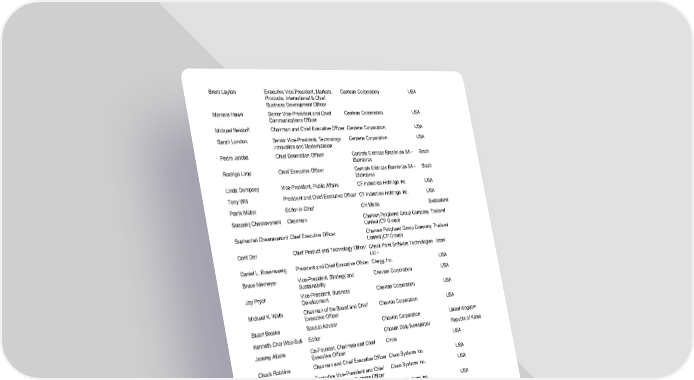 2022 - Annual Meeting 7 / 41 Brent Layton Executive Vice President, Markets, Products, International & Chief Business Development Officer Centene Corporation USA Marcela Hawn Senior Vice - President and Chief Communications Officer Centene Corporation USA Michael Neidorff Chairman and Chief Executive Officer Centene Corporation USA Sarah London Senior Vice - President, Technology Innovation and Modernization Centene Corporation USA Pedro Jatobá Chief Generation Officer Centrais Elétricas Brasileiras SA - Eletrobras Brazil Rodrigo Limp Chief Executive Officer Centrais Elétricas Brasileiras SA - Eletrobras Brazil Linda Dempsey Vice - President, Public Affairs CF Industries Holdings Inc. USA Tony Will President and Chief Executive Officer CF Industries Holdings Inc. USA Patrik Müller Editor - in - Chief CH Media Switzerland Soopakij Chearavanont Chairman Charoen Pokphand Group Company Limited (CP Group) Thailand Suphachai Chearavanont Chief Executive Officer Charoen Pokphand Group Company Limited (CP Group) Thailand Dorit Dor Chief Product and Technology Officer Check Point Software Technologies Ltd - Israel Daniel L. Rosensweig President and Chief Executive Officer Chegg, Inc. USA Bruce Niemeyer Vice - President, Strategy and Sustainability Chevron Corporation USA Jay Pryor Vice - President, Business Development Chevron Corporation USA Michael K. Wirth Chairman of the Board and Chief Executive Officer Chevron Corporation USA Stuart Brooks Special Adviser Chevron Corporation United Kingdom Kenneth Choi Woo - Suk Editor Chosun Daily Newspaper Republic of Korea Jeremy Allaire Co - Founder, Chairman and Chief Executive Officer Circle USA Chuck Robbins Chairman and Chief Executive Officer Cisco Systems Inc. USA Francine Katsoudas Executive Vice - President and Chief People, Policy and Purpose Officer Cisco Systems Inc. USA Jonathan Davidson Executive Vice - President and General Manager, Cisco Mass - Scale Infrastructure Cisco Systems Inc. USA Scott Herren Executive Vice - President and Chief Financial Officer Cisco Systems Inc. USA Tae Yoo Senior Vice - President, Corporate Affairs and Corporate S ocial Responsibility Cisco Systems Inc. USA Conrad Keijzer Chief Executive Officer Clariant International Ltd Switzerland David Novak Co - President Clayton, Dubilier & Rice LLC United Kingdom Eric Rouzier Partner Clayton, Dubilier & Rice LLC United Kingdom Manvinder Singh Banga Partner Clayton, Dubilier & Rice LLP United Kingdom Roberto Quarta Partner and Chairman, Europe Clayton, Dubilier & Rice LLP United Kingdom Michele Romanow Co - Founder and President Clear Finance Technology Inc - Clearbanc Canada Matthew Prince Co - Founder and Chief Executive Officer Cloudflare Inc. USA Marc Bayle de Jessé Chief Executive Officer CLS Bank International USA Khaled Igué Founder and President Club 2030 Afrique France Rodolphe Saade Chairman and Chief Executive Officer CMA CGM Group France Joe Kernen Co - Anchor, Squawk Box CNBC USA