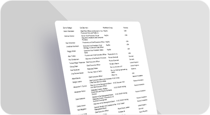 2022 - Annual Meeting 23 / 41 Zarrar Sehgal Co - Chairman Pathfinder Group Pakistan Aaron Karczmer Chief Risk Officer and Executive Vice - President, Risk and Platforms PayPal USA Andrea Donkor Senior Vice - President, Global Regulatory Relations and Consumer Practices PayPal USA Dan Schulman President and Chief Executive Officer PayPal USA Jonathan Auerbach Executive Vice - President; Chief Strategy, Growth and Data Officer PayPal USA Peggy Alford Executive Vice - President, Global Sales PayPal USA Alan Trefler Founder and Chief Executive Offic er Pegasystems Inc. USA Per Christensen Chairman of the Board of Directors PensionDanmark Denmark Torben Möger Pedersen Chief Executive Officer PensionDanmark Denmark Chirag Patel Chief Executive Officer Pentland Brands United Kingdom Kurt Bjorklund Managing Partner Permira Advisers LLP United Kingdom Jörg Rockenhäuser Partner, Head of DACH Permira Beteiligungsberatung GmbH Germany Albert Bourla Chief Executive Officer Pfizer Inc. USA Sergey Ivanov Chief Executive Officer and Chairman of the Executive Committee PJSC Alrosa Russian Federation Alexander V. Dyukov Chairman of the Management Board and Chief Executive Officer PJSC Gazprom Neft Russian Federation Alexander Petrov Managing Director, Plast ics, Elastomers and Organic Synthesis Division PJSC SIBUR Holding Russian Federation Daria Borisova Member of the Management Board; Managing Director, Innovations and Business Development PJSC SIBUR Holding Russian Federation Dmitry Konov Chairman of the Management Board PJSC SIBUR Holding Russian Federation Nail Maganov General Director and Chairman of the Management Board PJSC Tatneft Russian Federation Salman Amin Chief Executive Officer Pladis Foods Limited United Kingdom Michael A. Jarlner International Editor Politiken.dk Denmark Jean - Pascal Duvieusart Member of the Board; Chief Executive Officer, Home Credit PPF Group Czech Republic Ashraf Patel Co - Founder Pravah, ComMutiny - The Youth Collective and VartaLeap Coalitio n India Barun Jha National Editor Press Trust of India India Damon Jones Chief Communications Officer Procter & Gamble USA Selina Jackson Senior Vice - President, Global Government Relations and Public Policy Procter & Gamble USA Alexandra Keith Chief Executive Officer, Beauty; Executive Sponsor, Sustainability Procter & Gamble International Operations SA Switzerland Loic Tassel President, Europe Procter & Gamble International Operations SA Switzerland Virginie Helias Chief Sustainability Officer Procter & Gamble International Operations SA Switzerland Rod Hochman President and Chief Executive Officer Providence USA Shriti Vade ra Chair Prudential Plc United Kingdom Tan Chong - Meng Group Chief Executive Officer PSA International Pte Ltd Singapore Anindya Novyan Bakrie Chief Executive Officer, President Director PT Bakrie & Brothers Tbk Indonesia Muhamad Chatib Basri Chairman PT Bank Mandiri (Persero) Tbk Indonesia Axton Salim Director and Member of the Board PT Indofood CBP Sukses Makmur Tbk Indonesia